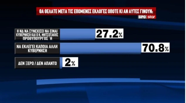 Μετά τις επόμενες εθνικές εκλογές, όποτε κι αν γίνουν, το 27,2% δηλώνει ότι θα ήθελε να είναι κυβέρνηση η ΝΔ και πρωθυπουργός ο Κ. Μητσοτάκης ενώ το 70,8% δηλωνει ότι θα ήθελε να εκλεγεί κάποια άλλη κυβέρνηση.