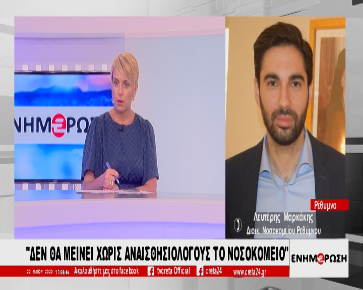 Για προσωρινή επίλυση του προβλήματος που προέκυψε στο νοσοκομείο Ρεθύμνου, ως προς τους αναισθησιολόγους, έκανε λόγο ο Διοικητής του Νοσοκομείου Λευτέρης Μαρκάκης, μιλώντας στον περιφερειακό τηλεοπτικό σταθμό CRETA και στην Αντιγόνη Ανδρεάκη.