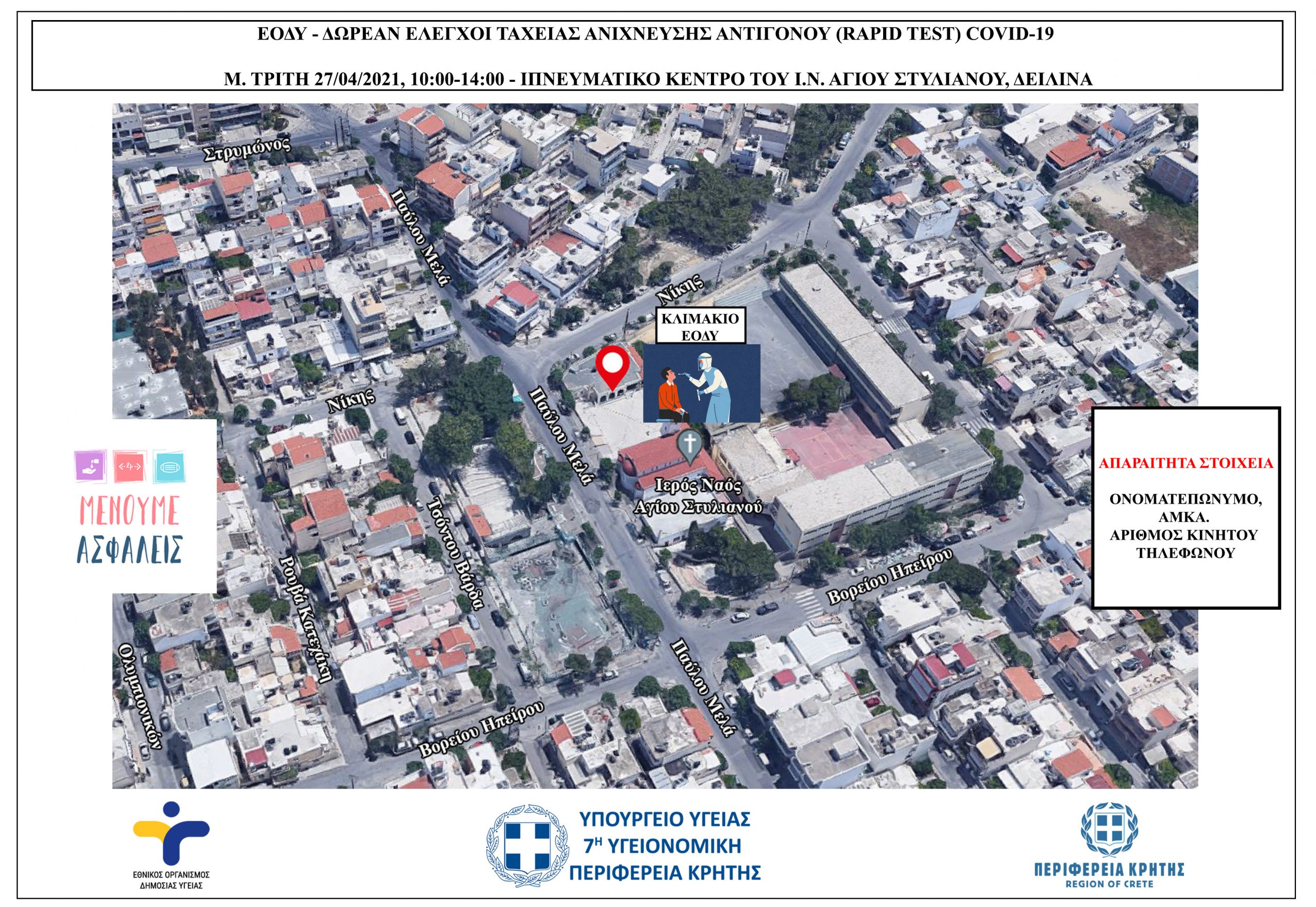 Έλεγχοι ταχείας ανίχνευσης αντιγόνου Covid-19 (rapid test) σε πεζούς, θα πραγματοποιηθούν την Μ.Τρίτη 27/04/2021 από κλιμάκια του ΕΟΔΥ στην περιοχή Δειλινά στο Ηράκλειο.