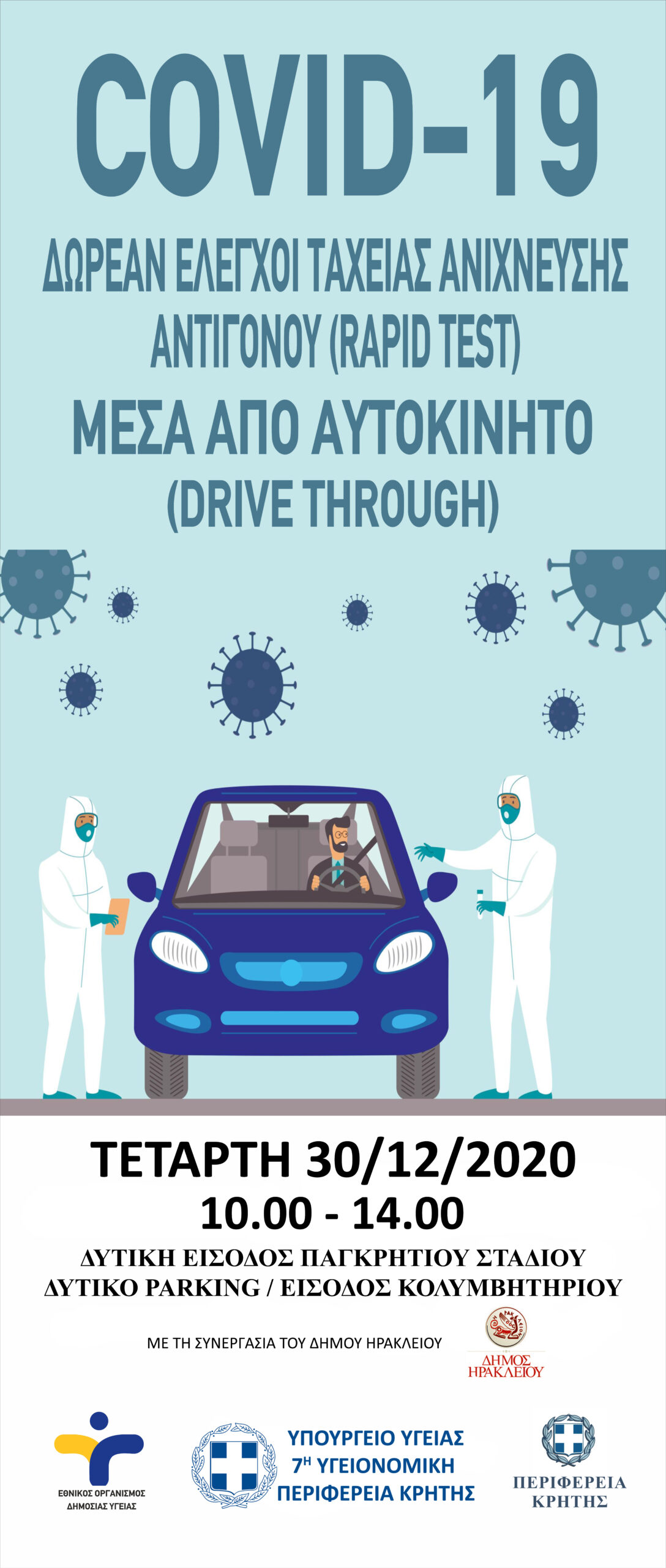 Έλεγχοι ταχείας ανίχνευσης αντιγόνου Covid-19 (rapid test) μέσα από αυτοκίνητο (drive through) θα πραγματοποιηθούν την Τετάρτη 30/12/2020 από κλιμάκιο του ΕΟΔΥ στο Ηράκλειο.