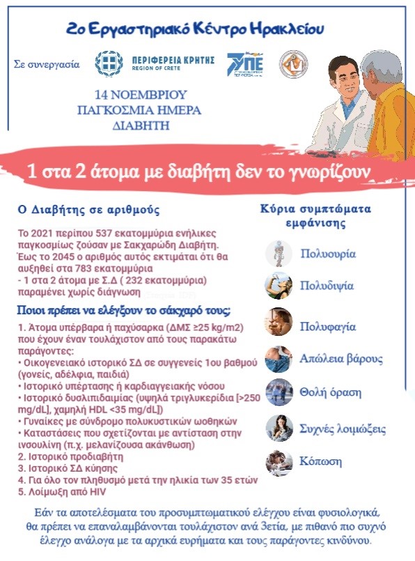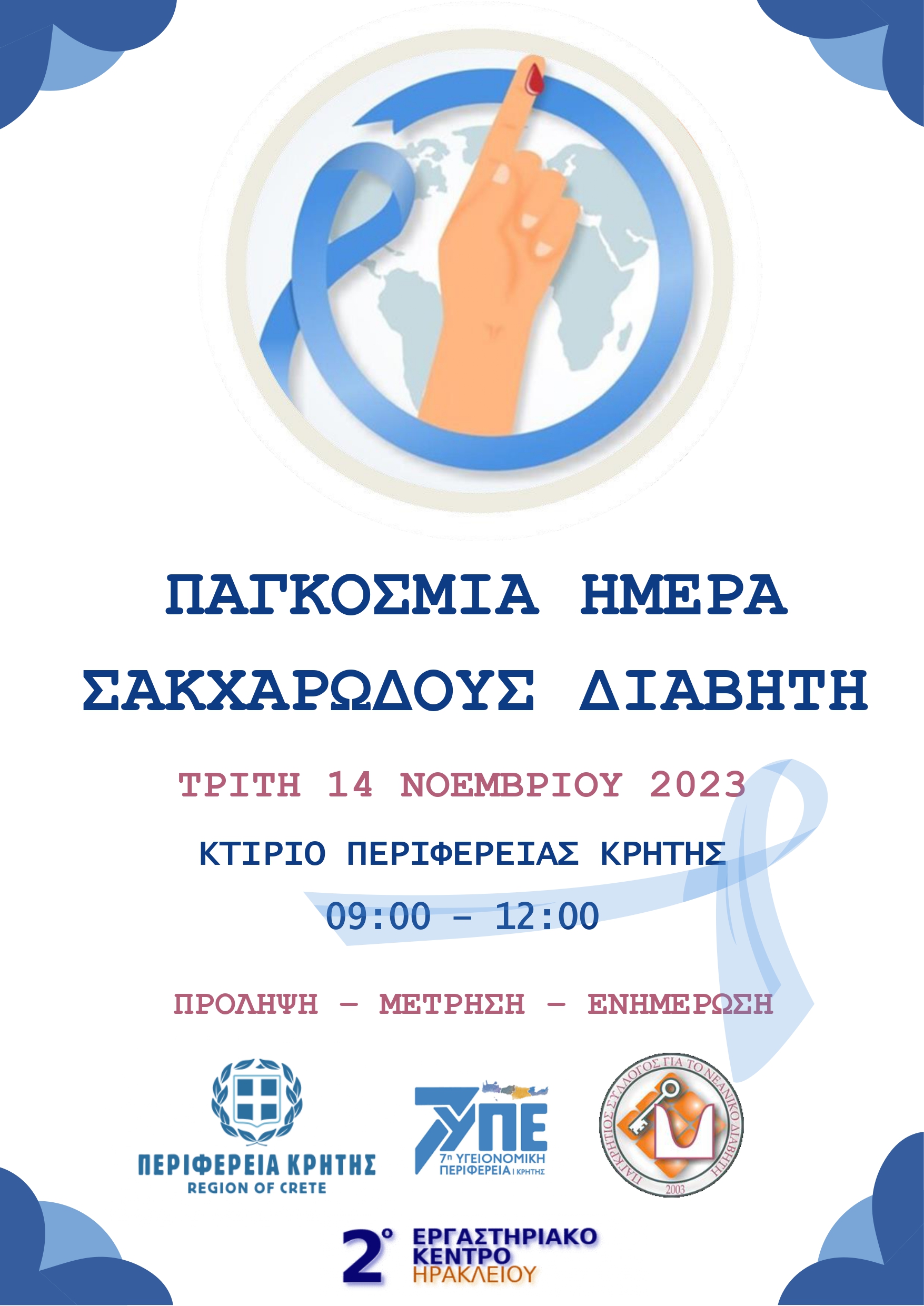 Η Περιφέρεια Κρήτης με αφορμή την «Παγκόσμια Ημέρα Διαβήτη» διοργανώνει την Τρίτη 14 Νοεμβρίου δράσεις ενημέρωσης και ευαισθητοποίησης σε συνεργασία με το 2ο Εργαστηριακό Κέντρο Ηρακλείου, Τομέας Υγείας-Πρόνοιας-Ευεξίας ειδικότητας Βοηθών Νοσηλευτών, τον Παγκρήτιο Σύλλογο για το Νεανικό Διαβήτη και την 7η ΥΠΕ.