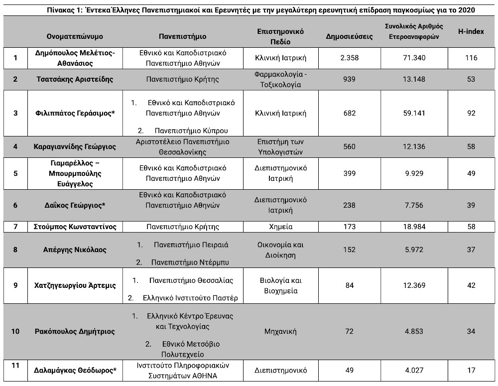 Στον πίνακα παρουσιάζονται οι 11 έλληνες Πανεπιστημιακοί και οι ερευνητές που εργάζονται σε ελληνικά ιδρύματα και σύμφωνα με την κατάταξη έχουν πολύ σημαντική ερευνητική επίδραση παγκοσμίως. Στον εν λόγω πίνακα , παρουσιάζεται το συνολικό ερευνητικό τους έργο σε επίπεδο δημοσιεύσεων, συνόλου ετεροαναφορών και δείκτη H-index, όπως αυτά αποτυπώνονται στα διαθέσιμα στοιχεία της βάσης publons του Web of Science. Στις περιπτώσεις που δεν εμφανίζονται στοιχεία στη βάση publons επειδή οι ερευνητές δεν έχουν δημιουργήσει ή εμπλουτίσει το προφίλ τους στη βάση, έχει χρησιμοποιηθεί το εργαλείο WoS Author Search (με αστερίσκο στον πίνακα).