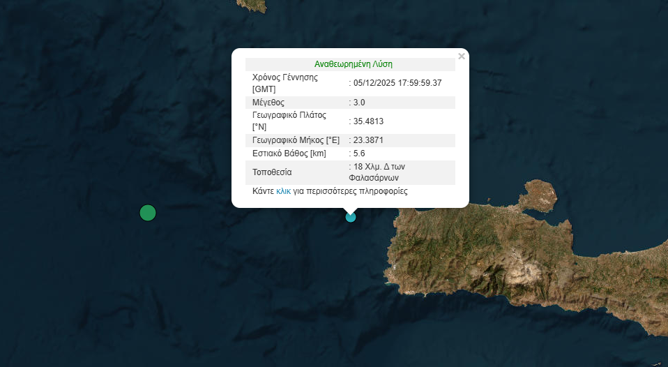 Πιο συγκεκριμένα, σεισμός 3 βαθμών της κλίμακας ρίχτερ σημειώθηκε στα Φαλάσαρνα του νομού Χανίων. Σύμφωνα με το Γεωδυναμικό Ινστιτούτο Αθηνών, ο σεισμός έχει καταγραφεί στις 19:59, με επίκεντρο 18 Χλμ. Δ των Φαλασάρνων.