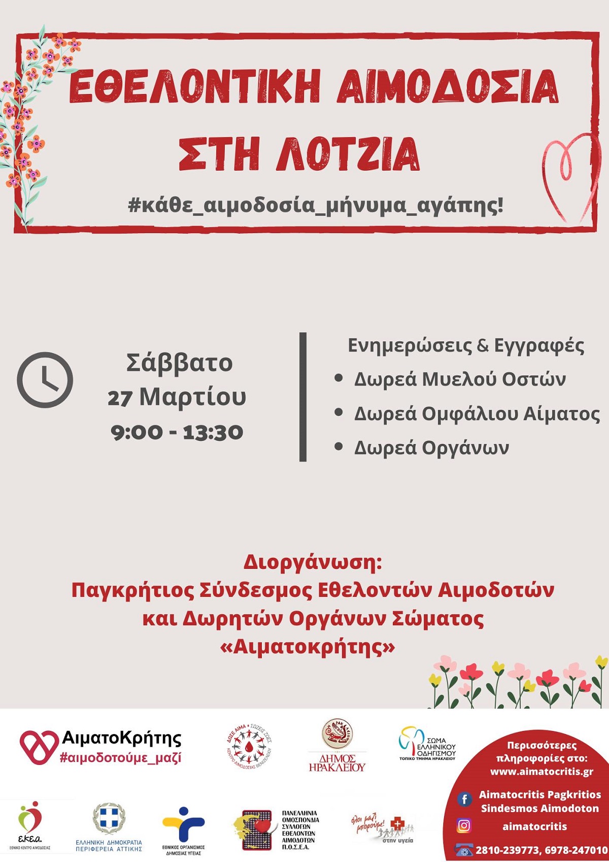 Για οποιαδήποτε διευκρίνιση στα τηλέφωνα: 2810239773 και 6978247010 και e-mail: aimatocritis@hotmail.com -www.aimatocritis.gr