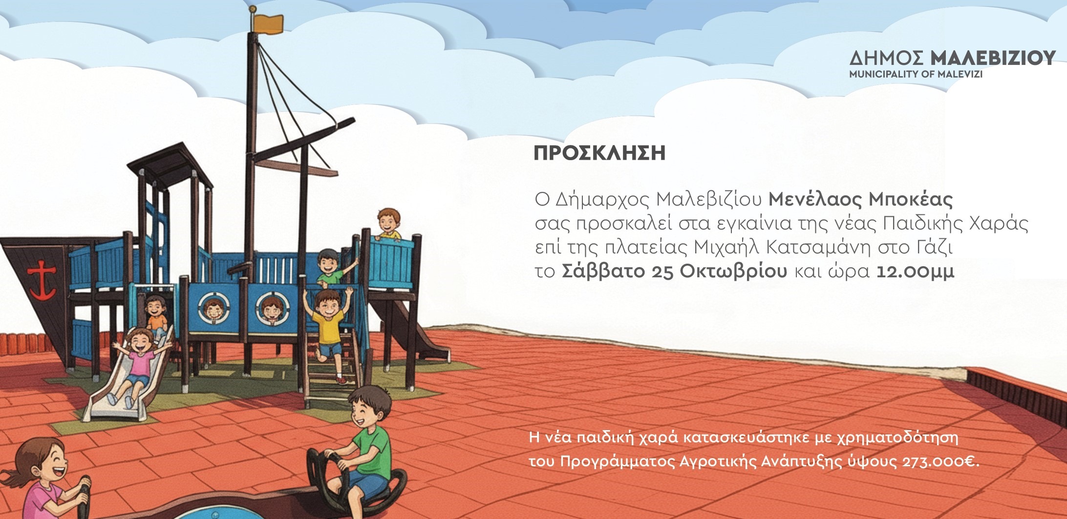 Το Σάββατο στις 12:00 το μεσημέρι, ο Δήμαρχος Μαλεβιζίου Μενέλαος Μποκέας θα εγκαινιάσει τη νέα παιδική χαρά που διαμορφώθηκε στην Πλατεία Μιχαήλ Κατσαμάνη στο Γάζι, με χρηματοδότηση ύψους 273.000 ευρώ από το Πρόγραμμα Αγροτικής Ανάπτυξης μέσω της Αναπτυξιακής Ηρακλείου.