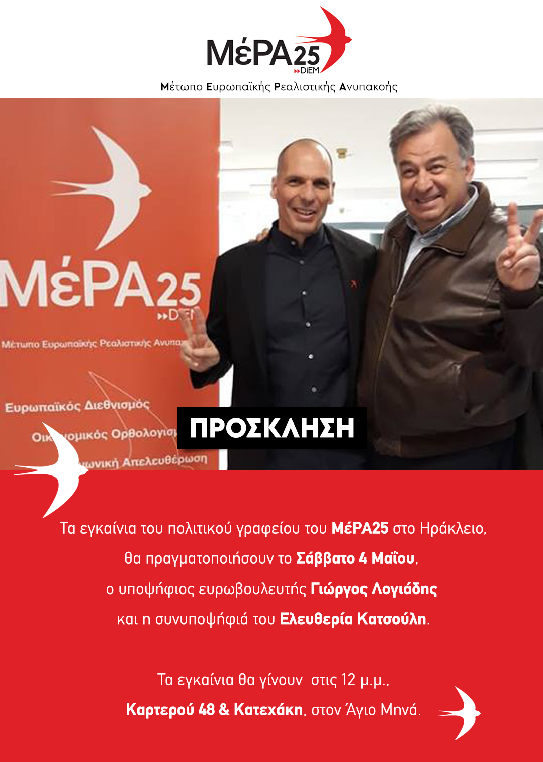 Το πολιτικό γραφείο του ΜέΡΑ25 στο Ηράκλειο, βρίσκεται στη συμβολή των οδών Καρτερού 48 & Κατεχάκη , στον Άγιο Μηνά.