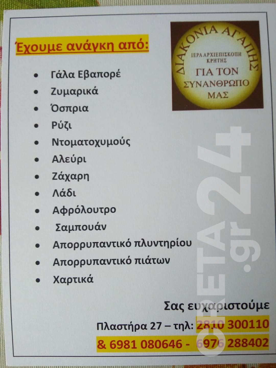 Πρωτόγνωρες είναι οι ανάγκες σε επίπεδο τοπικής κοινωνίας ακόμα και για βασικά αγαθά. Σε αυτό το πλαίσιο συνεχίζεται το κοινωνικό έργο της «Διακονίας της Αγάπης» της Ιεράς Αρχιεπισκοπής Κρήτης.