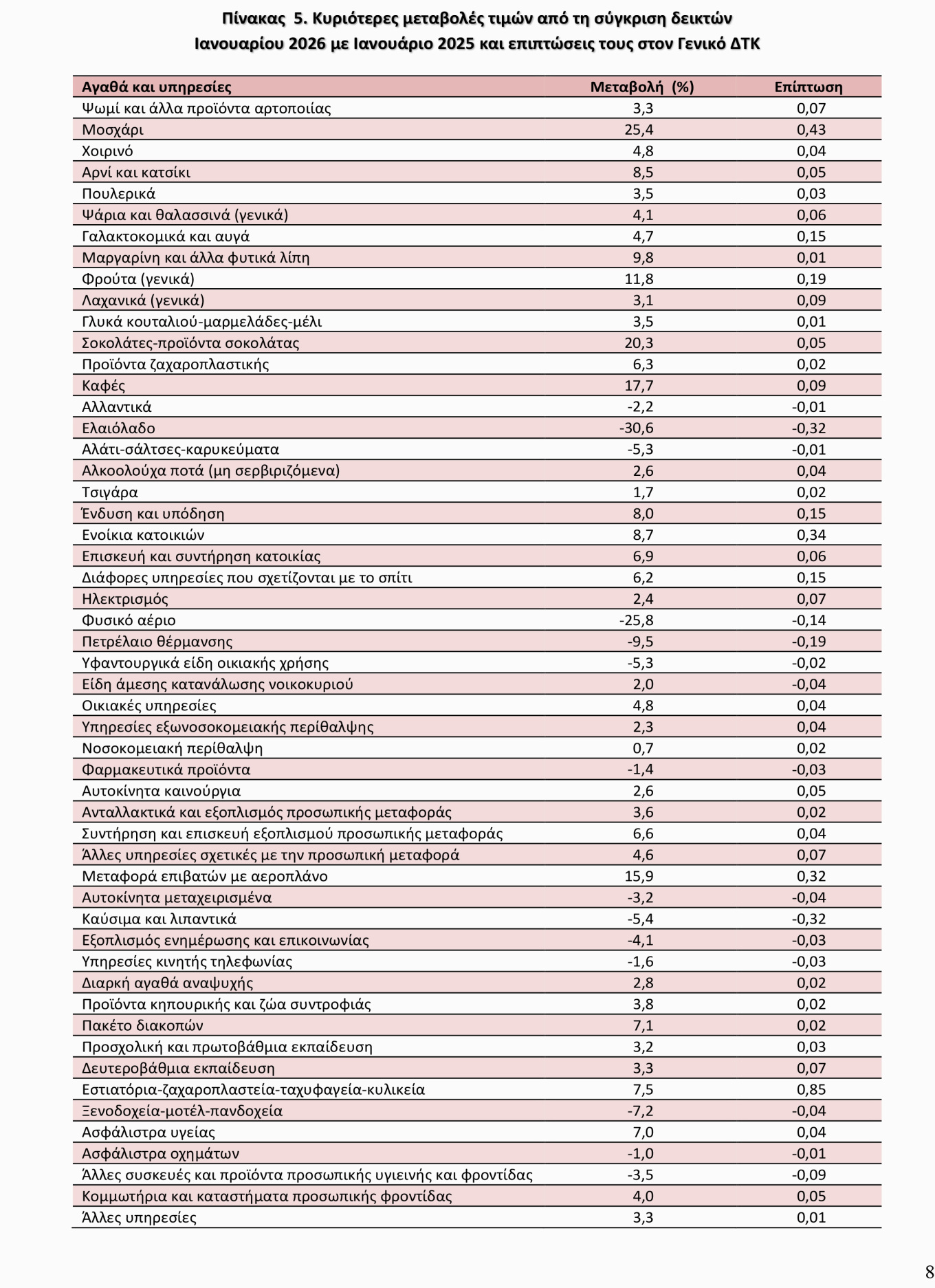 Αναλυτικά, η αύξηση του Γενικού Δείκτη Τιμών Καταναλωτή κατά 2,5% τον Ιανουάριο 2026 προήλθε κυρίως από τις μεταβολές στις ακόλουθες ομάδες αγαθών και υπηρεσιών: