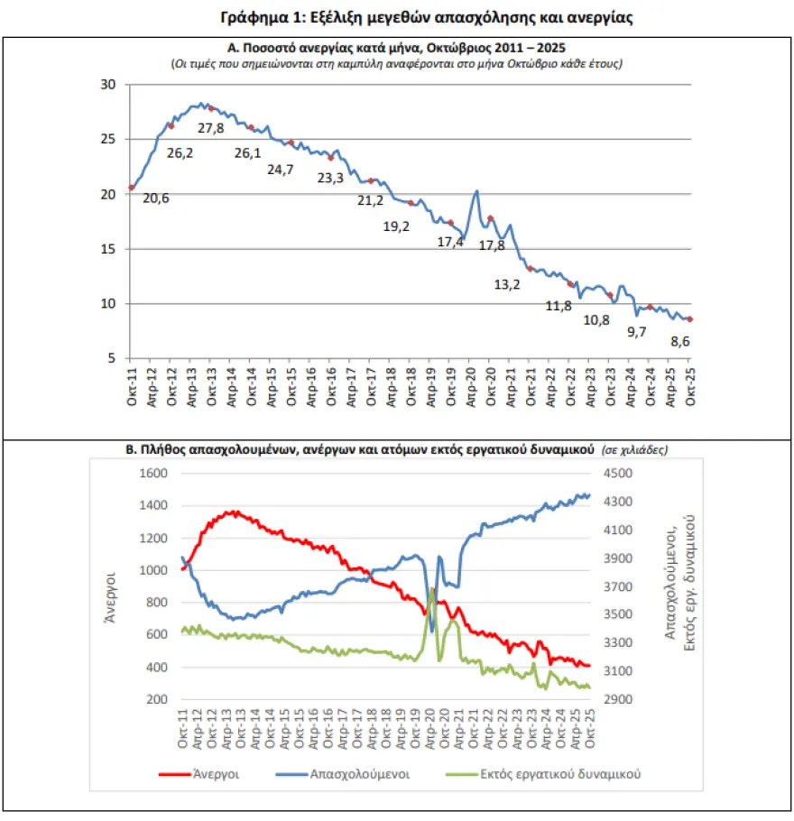 Οι άνεργοι ανήλθαν σε 411.369 άτομα, σημειώνοντας μείωση κατά 50.326 άτομα σε σχέση με τον Οκτώβριο του 2024 (-10,9%) και αύξηση κατά 1.000 άτομα σε σχέση με τον Σεπτέμβριο του 2025 (0,2%).