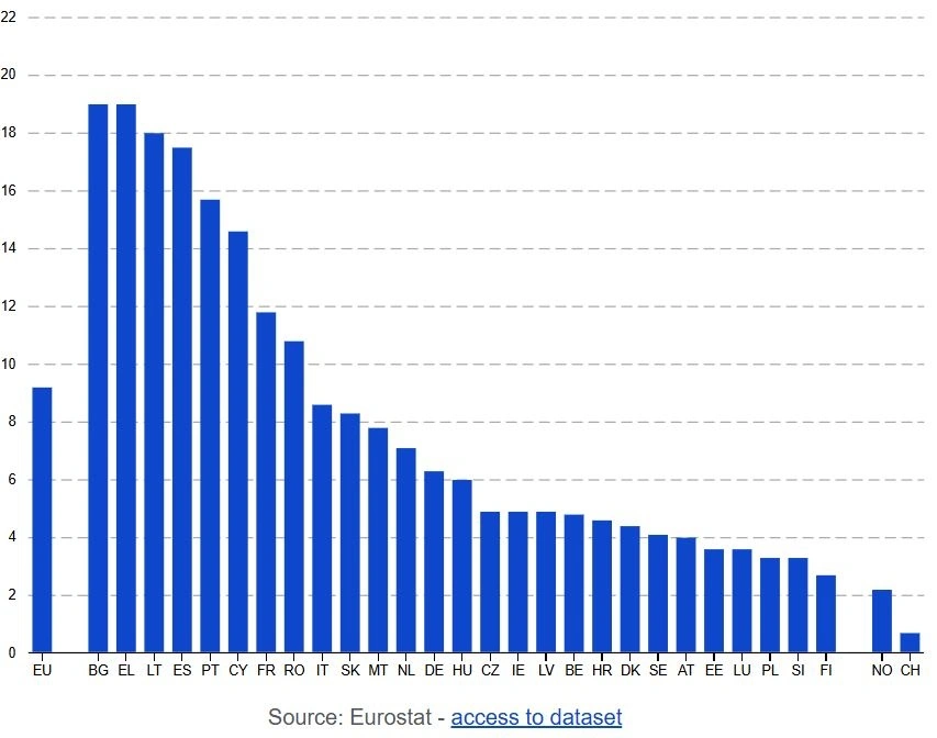 Τα υψηλότερα ποσοστά παρατηρήθηκαν στη Βουλγαρία και την Ελλάδα (και οι δύο 19%), ακολουθούμενες από τη Λιθουανία και την Ισπανία (και οι δύο 18%), ενώ η Φινλανδία, η Σλοβενία και η Πολωνία (όλες κάτω από 3%) είχαν τα χαμηλότερα ποσοστά.