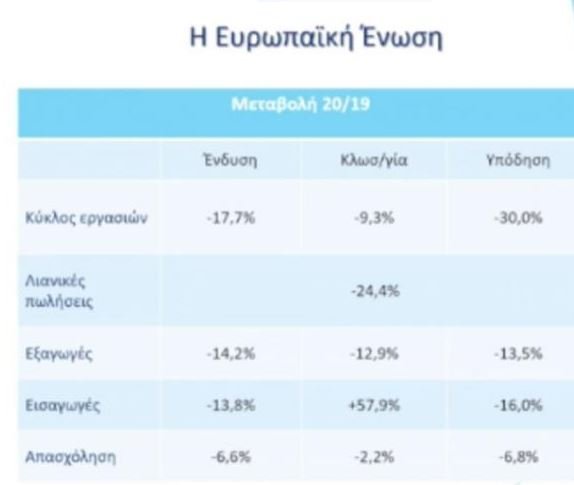 Σε ευρωπαϊκό επίπεδο το μεγαλύτερο πλήγμα δέχθηκε η υπόδηση, χάνοντας 30% του τζίρου της, με την ένδυση να ακολουθεί με -30% ενώ η κλωστοϋφαντουργία είχε την μικρότερη μείωση (9.3%) κυρίως χάρη στην έκρηξη εισαγωγών από Κίνα κυρίως για μάσκες προστασίας, στολές κλπ.