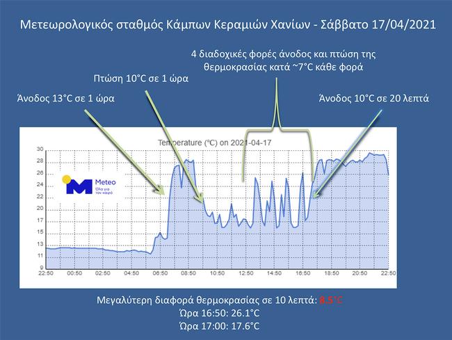 Στους Κάμπους Κεραμιών Χανίων, περιοχή που βρίσκεται περίπου δέκα χιλιόμετρα νότια της πόλης των Χανίων, ο μετεωρολογικός σταθμός του Εθνικού Αστεροσκοπείου Αθηνών κατέγραψε εντυπωσιακές διακυμάνσεις της θερμοκρασίας κατά τη διάρκεια του Σαββάτου. Το διάγραμμα που παρατίθεται δείχνει τις μεταβολές θερμοκρασίας μέσα στην ημέρα όπου εντοπίζουμε συνεχείς μεταβολές της θερμοκρασίας οι οποίες συναρτώνται με τη διεύθυνση του ανέμου.
