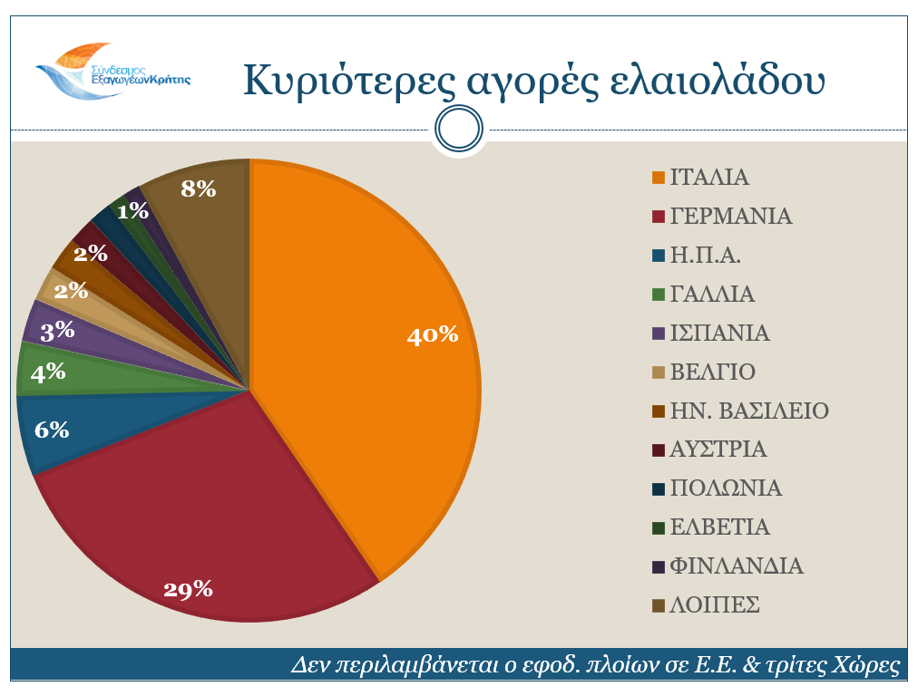 Σχετικά με τις αγορές, οι κυριότεροι αγοραστές των Κρητικών προϊόντων είναι η Γερμανία (μερίδιο 20,3%), η Ιταλία (17%), η Γαλλία (6,1%), η Ολλανδία (5,7%) και η Πολωνία (4,3%). Τη δεκάδα των κυριότερων αγοραστών κλείνουν οι Η.Π.Α., το Ηνωμένο Βασίλειο, η Κύπρος, η Ισπανία και η Αυστρία.