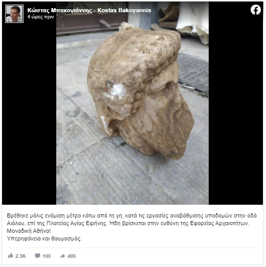 Όπως αναφέρει σε ανάρτησή του στο Facebook ο Κώστας Μπακογιάννης, το εύρημα – μια αρχαία προτομή– βρέθηκε κατά την διάρκεια εργασιών του δήμου Αθηναίων.