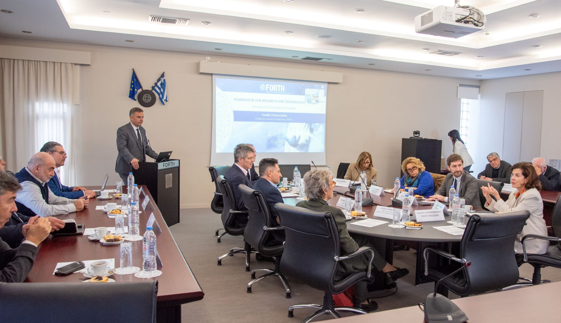 Τους επισκέπτες υποδέχτηκε ο Πρόεδρος του ΙΤΕ Καθηγητής Βασίλης Χαρμανδάρης και αφού τους ενημέρωσε εκτενώς για τις δραστηριότητες του Ιδρύματος, παρουσία Διευθυντών & Αν. Διευθυντών των Ινστιτούτων και ερευνητών, ακολούθησε γόνιμη συζήτηση σχετικά με τις προοπτικές ενίσχυσης της ακαδημαϊκής και επιστημονικής συνεργασίας μεταξύ Ελλάδας και Γαλλίας.