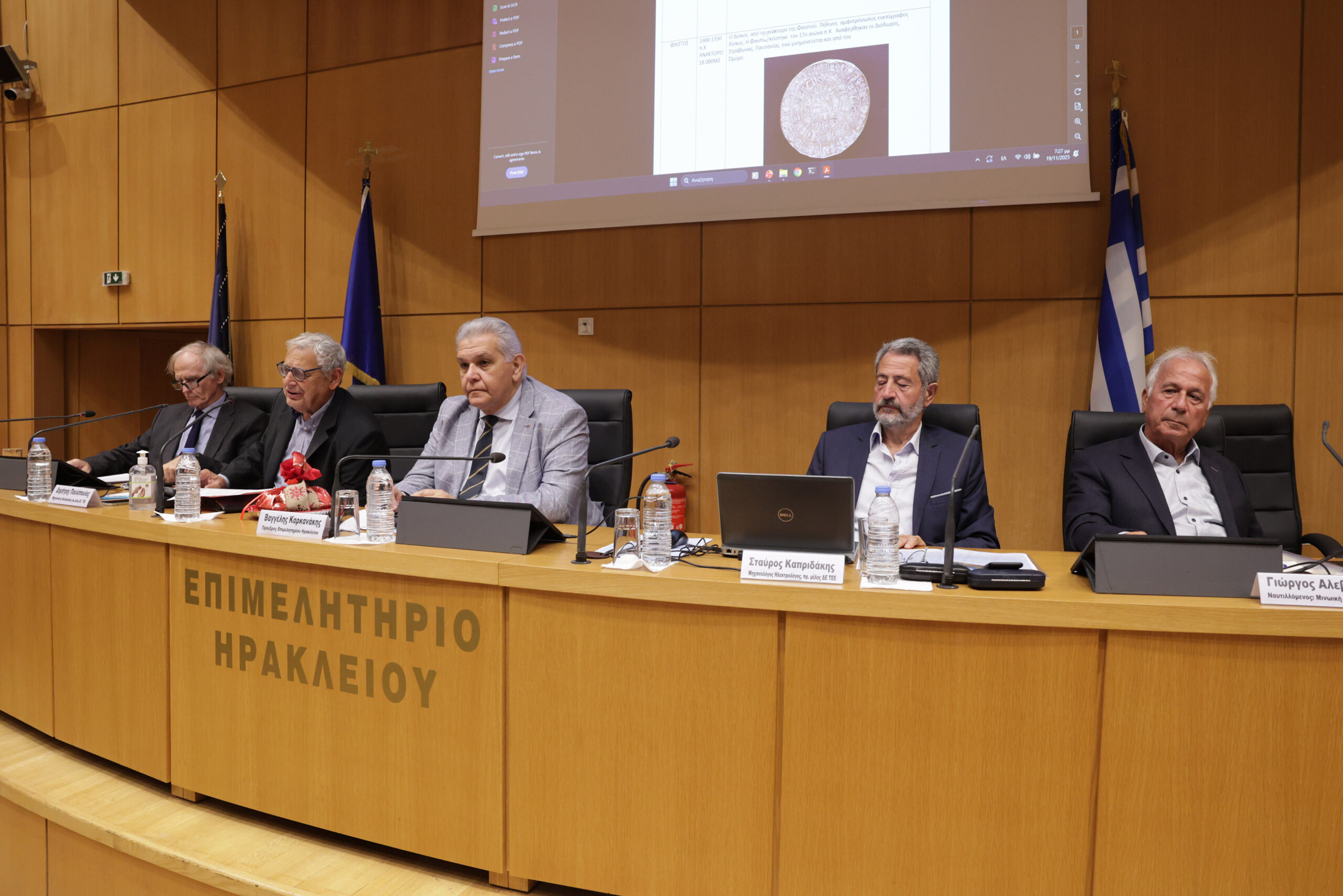 Η εκδήλωση διοργανώθηκε από το Επιμελητήριο Ηρακλείου με χορηγό την Εταιρία ΛΑΤΩ και σε συνεργασία με την Επιτροπή Πρωτοβουλίας Μινωικού Πολιτισμού – UNESCO και ομιλητές τα μέλη της Επιτροπής Δημήτρη Παυλόπουλο, Μηχανολόγο Μηχανικό, Σταύρο Καπριδάκη, Ηλεκτρολόγο Μηχανικό, πρώην Εκτ. Διευθυντή ΟΤΕ, Γιώργο Αλεβίζο, Στέλεχος της Εμπορικής Ναυτιλίας και Νικόλαο Ηλιάδη, Επίτιμο μέλος του Παιδαγωγικού Ινστιτούτου.