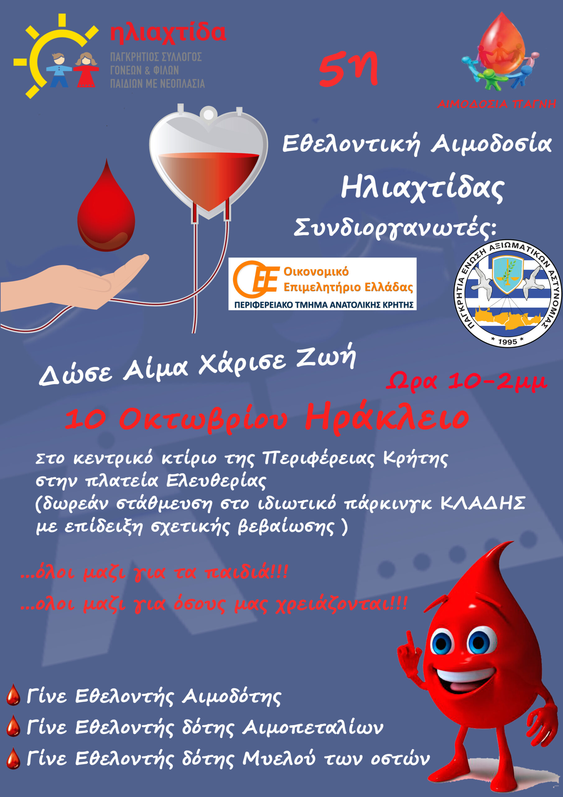 Ο Παγκρήτιος Σύλλογος Γονέων & Φίλων Παιδιών με Νεοπλασία «Η Ηλιαχτίδα», με την Αιμοδοσία του ΠΑ.Γ.Ν.Η., την Παγκρήτια Ένωση Αξιωματικών Αστυνομίας (Π.ΕΝ.Α.Α.) και το Περιφερειακό Τμήμα Ανατολικής Κρήτης του Οικονομικού Επιμελητηρίου Ελλάδας (Ο.Ε.Ε./Τ.Α.Κ.) συνδιοργανώνουν εθελοντική αιμοδοσία, το Σάββατο 10 Οκτωβρίου 2020, στο κεντρικό κτήριο της Περιφέρειας Κρήτης στην Πλατεία Ελευθερίας από τις 10:00π.μ. έως τις 14:00μ.μ.