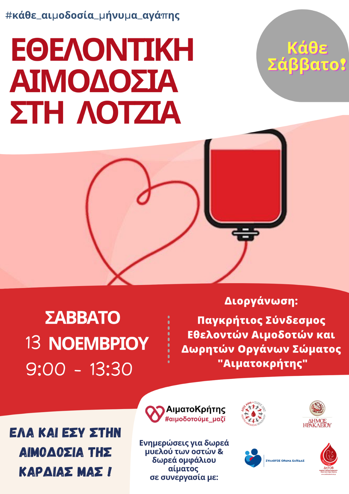 Εθελοντική Αιμοδοσία θα πραγματοποιηθεί το Σάββατο 13.11.2021 στο κέντρο της πόλης του Ηρακλείου (στο Αίθριο της Λότζια), από τις 09:00 έως τις 13:30. Πρόκειται για μια κοινή προσπάθεια αιμοδοσίας, την οποία συντονίζουν: