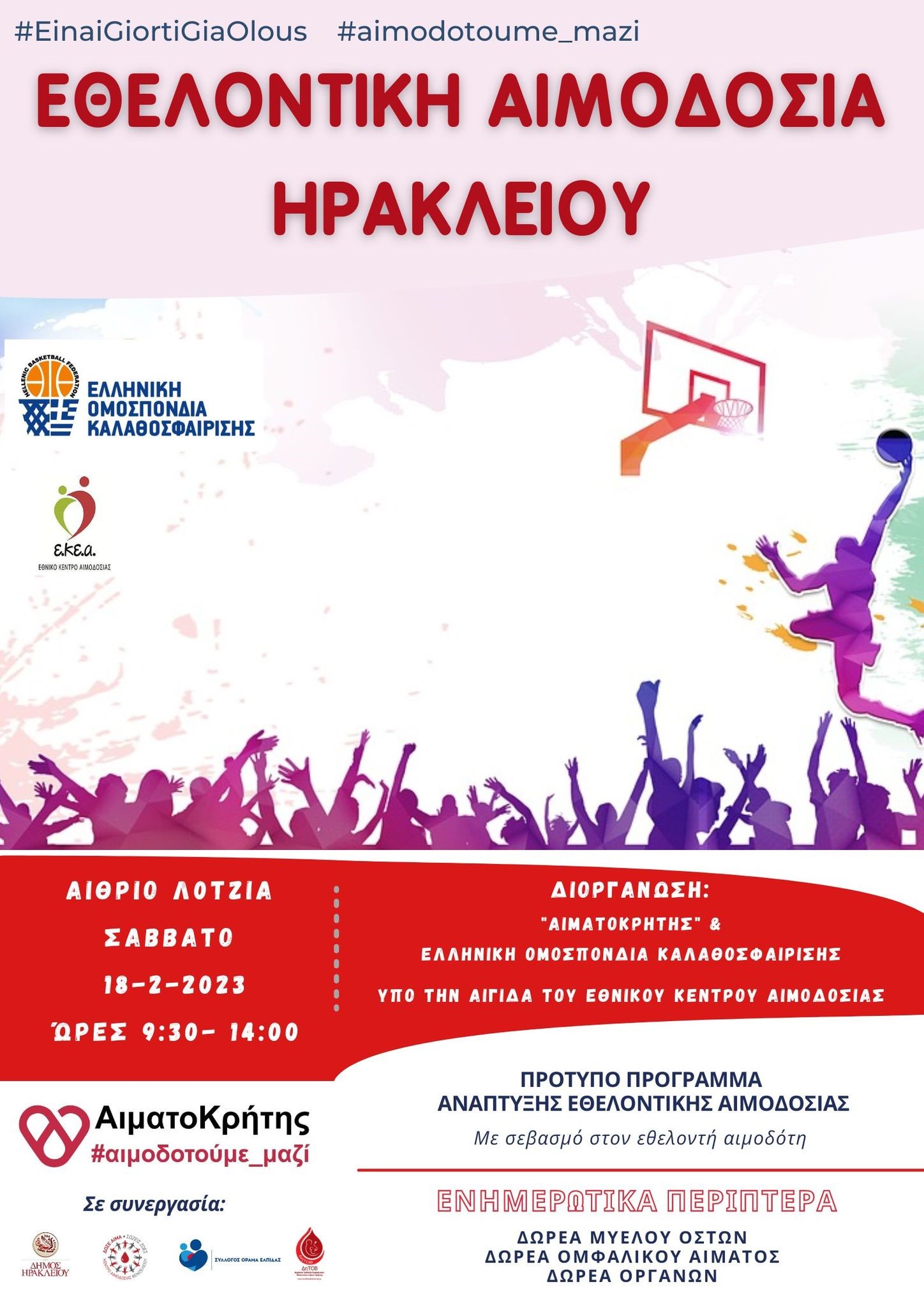 Διοργανωτές της αιμοδοσίας είναι ο Παγκρήτιος Σύνδεσμος Εθελοντών Αιμοδοτών και Δωρητών Οργάνων Σώματος «Αιματοκρήτης» και η Ελληνική Ομοσπονδία Καλαθοσφαίρισης (ΕΟΚ), υπό την αιγίδα του Εθνικού Κέντρου Αιμοδοσίας, με τη στήριξη του Δήμου Ηρακλείου και της Αντιδημαρχίας Πολιτισμού – Εθελοντισμού.