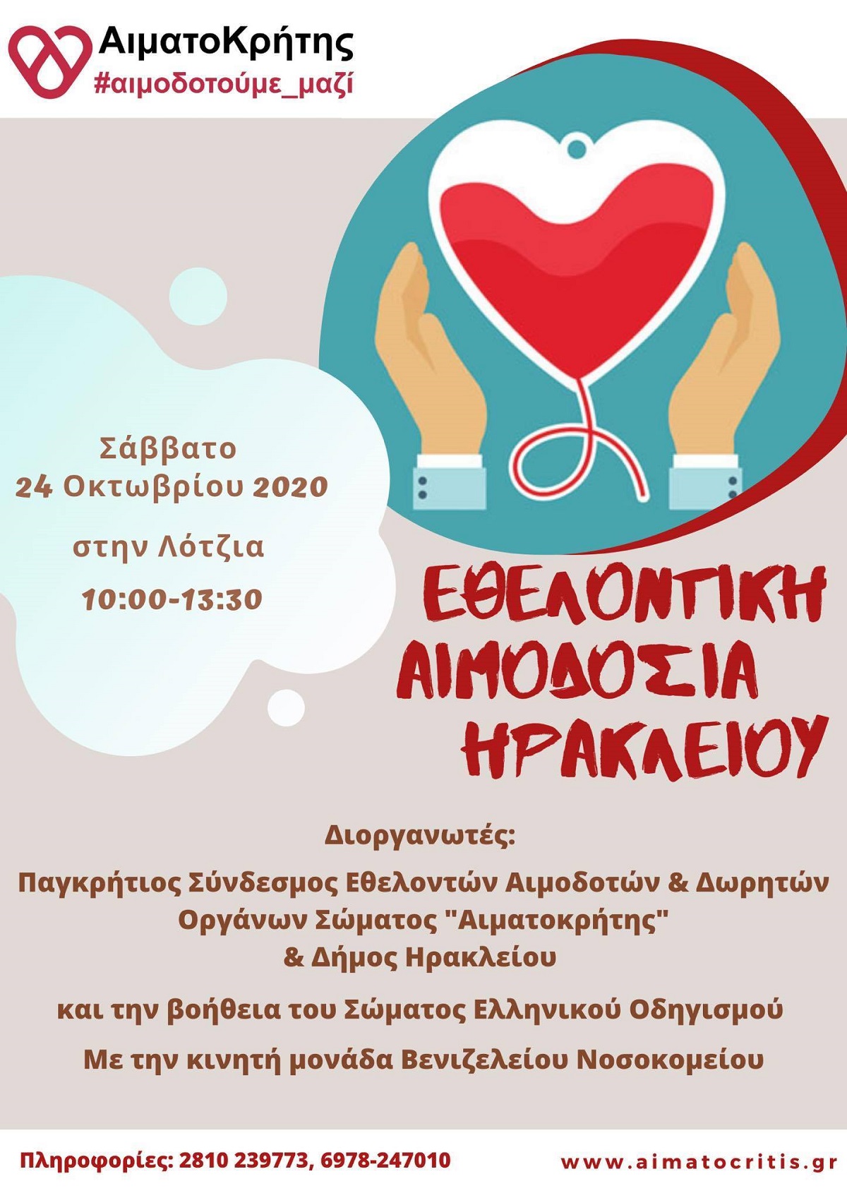 Εθελοντική Αιμοδοσία θα πραγματοποιηθεί το Σάββατο 24.10.2020 στο κέντρο της πόλης του Ηρακλείου (στο Αίθριο της Λότζια), από τις 10:00 έως τις 13:30.