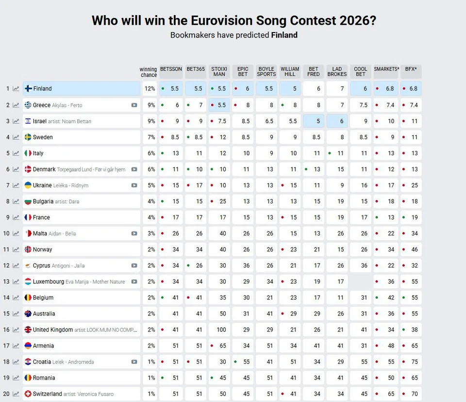 Όπως μπορεί να δει κανείς στον πίνακα με το σύνολο των στοιχηματικών εταιρειών, η Ελλάδα έχει περάσει το Ισραήλ, το οποίο βρίσκεται στην Τρίτη θέση παρόλο που δεν έχει ανακοινώσει ακόμη το τραγούδι του. Στην πρώτη θέση βρίσκεται η Φινλανδία η οποία επίσης δεν έχει ακόμη επιλέξει το τραγούδι που θα την εκπροσωπήσει.