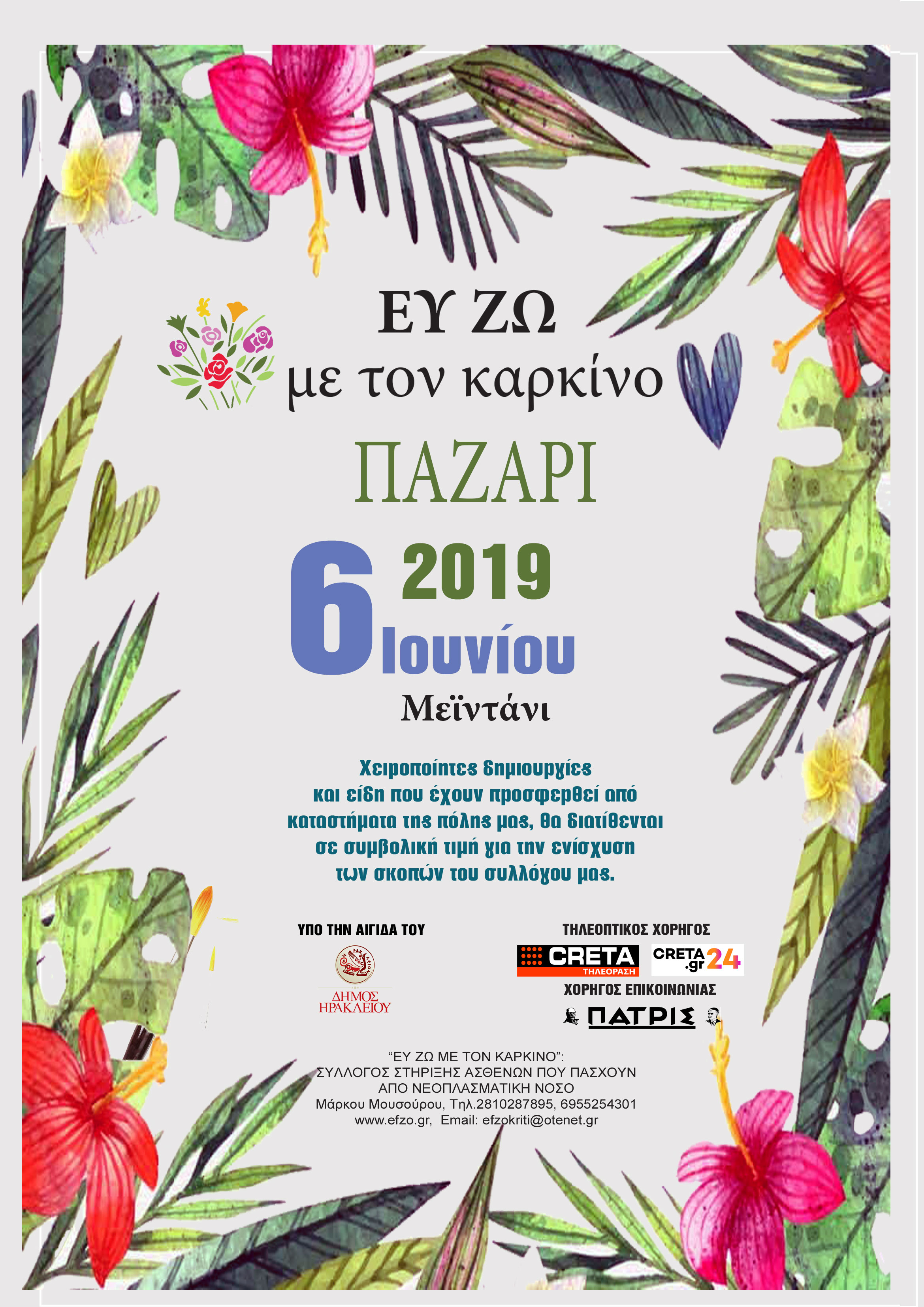 Ο Σύλλογος στήριξης «Ευ Ζω με τον Καρκίνο», θα πραγματοποιήσει το παζάρι του 2019, την Πέμπτη 6 Ιουνίου 2019 και ώρα από τις 9π.μ έως τις 10 μ.μ, στη συμβολή των οδών 1821 και 1866 (Μεϊντάνι).