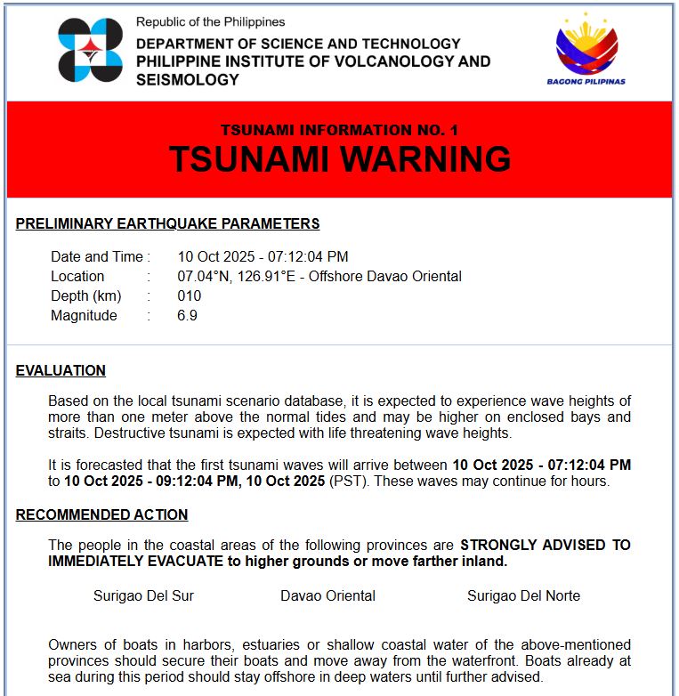 Οι αρχές καλούν τους κατοίκους των παράκτιων περιοχών του Surigao del Sur, του Davao Oriental και του Surigao del Norte να μετακινηθούν σε υψηλότερα εδάφη, μετά την έκδοση προειδοποίησης για τσουνάμι.