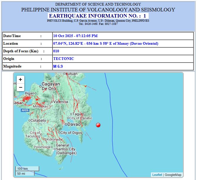 Ο σεισμός των 6,9 Ρίχτερ καταγράφηκε στις 7:12 μ.μ. τοπική ώρα και έγινε αισθητός σε διάφορα μέρη του Μιντανάο, προκαλώντας προειδοποίηση για τσουνάμι στις γειτονικές παράκτιες επαρχίες, σύμφωνα με την υπηρεσία PHIVOLCS.
