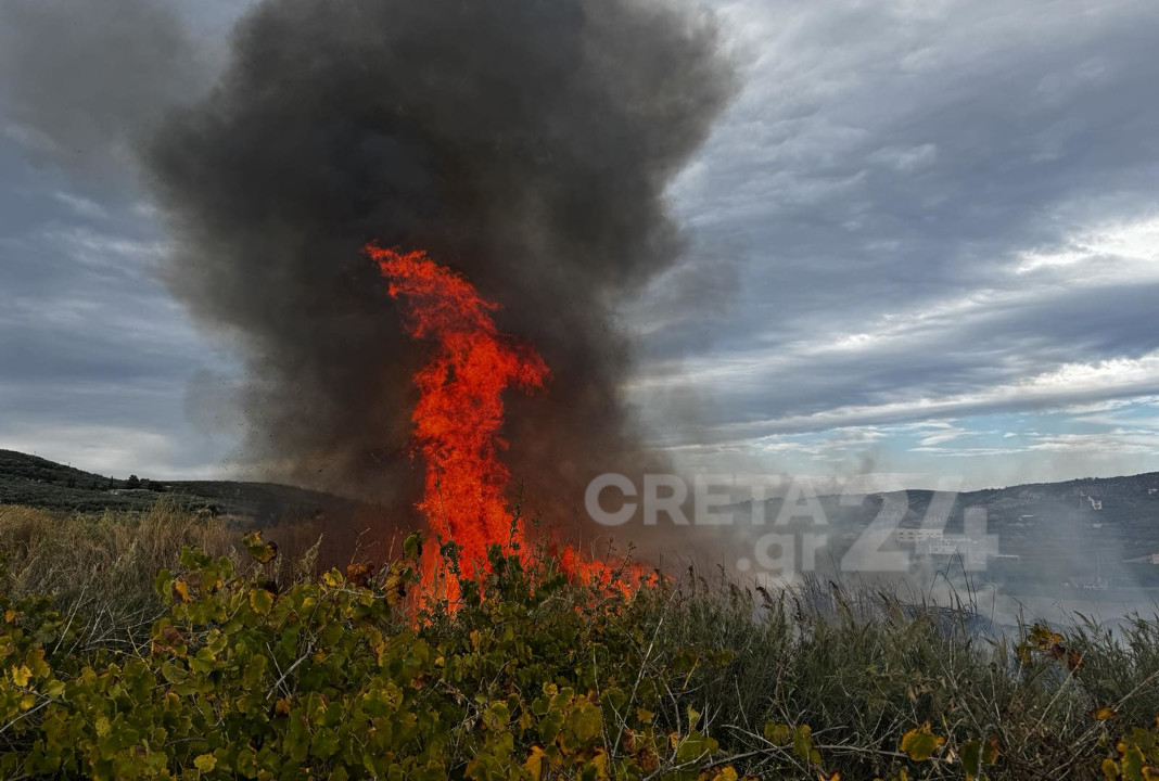 Το έργο των πυροσβεστών δυσκολεύουν οι ισχυροί άνεμοι που πνέουν σήμερα στο Ηράκλειο.
