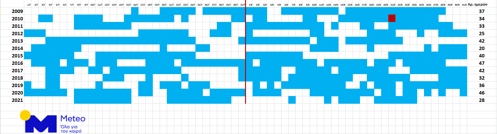 Τον Ιούλιο του 2021 ο αριθμός των ημερών ήταν 17, ενώ τον Αύγουστο ισχυρό μελτέμι έπνεε στο Αιγαίο μόνο τις 11 από τις 31 ημέρες του μήνα. Ο σχετικά μικρός αριθμός των ημερών με ισχυρό μελτέμι στο Αιγαίο, σύμφωνα με τους ερευνητές του meteo Κ. Λαγουβάρδο και Β. Κοτρώνη, συνδέεται άμεσα με τις μετεωρολογικές συνθήκες που οδήγησαν στους μεγάλους και παρατεταμένους καύσωνες του φετινού καλοκαιριού.