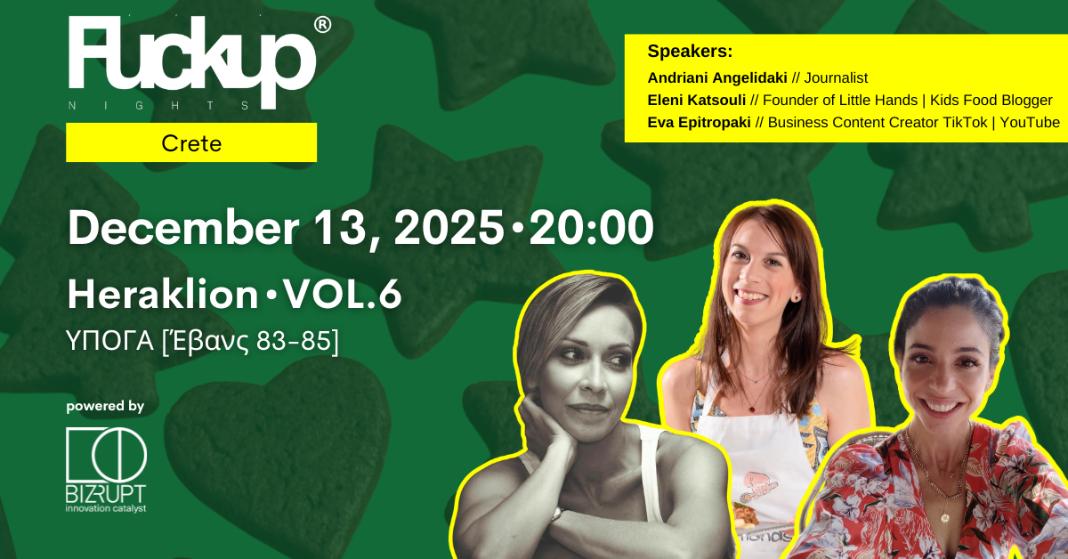 Έρχεται για ακόμα μία φορά στο Ηράκλειο η εκδήλωση που μοιραζόμαστε τις αποτυχίες μας, το Fuckup Nights Crete // VOL.6 (bit.ly/FUN-CRETE-6). Το Σάββατο 13 Δεκεμβρίου, στις 20:00, στην ΥΠΟΓΑ (Έβανς 83 – 85, Ηράκλειο)!