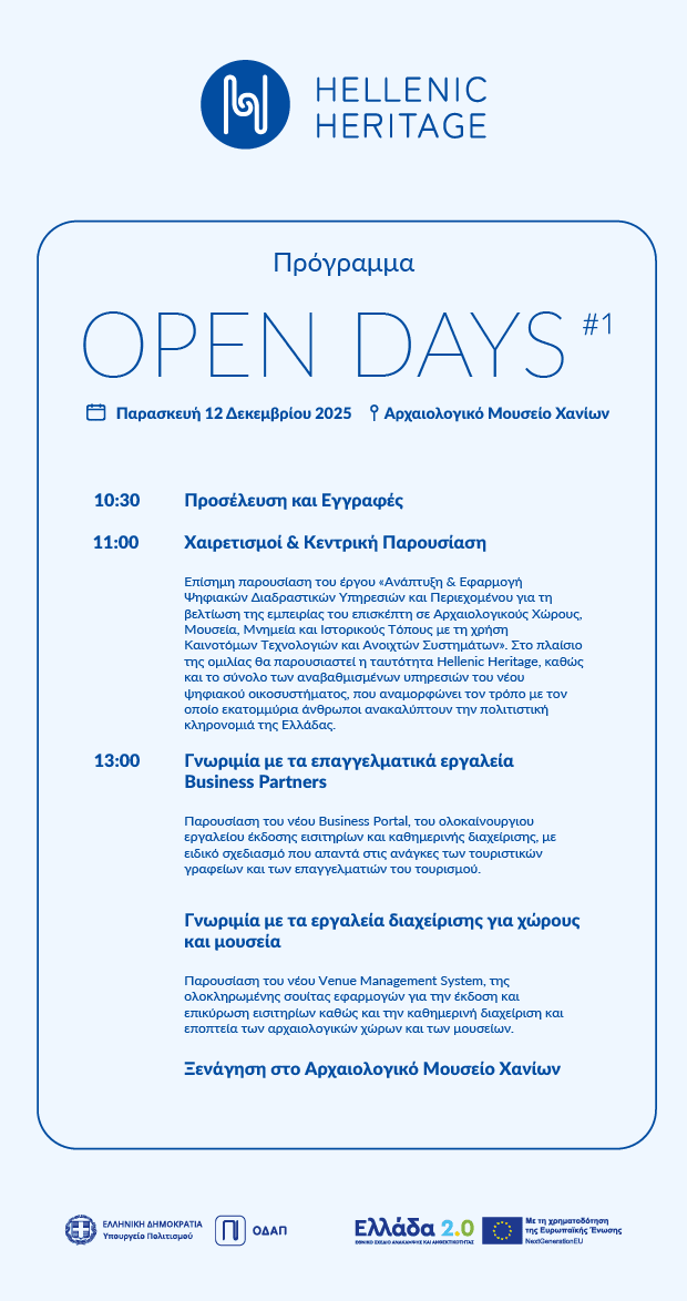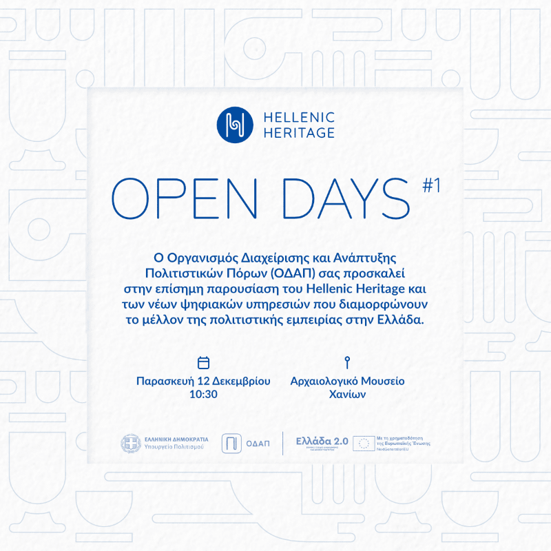Η επίσημη παρουσίαση θα πραγματοποιηθεί στο πλαίσιο της εκδήλωσης «Hellenic Heritage – Open Days #1: Νέες Υπηρεσίες, Νέες Εμπειρίες», την Παρασκευή 12 Δεκεμβρίου 2025, στις 10:30, στο Αρχαιολογικό Μουσείο Χανίων. Κατά τη διάρκεια της εκδήλωσης, το κοινό θα μπορεί να περιηγηθεί στην πλατφόρμα hh.gr, να δοκιμάσει τις εφαρμογές Augmented Reality και να βιώσει πώς η τεχνολογία αναβαθμίζει την πολιτιστική εμπειρία.