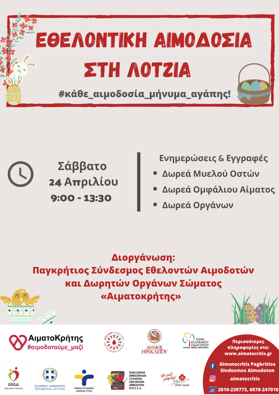 Εθελοντική Αιμοδοσία θα πραγματοποιηθεί το Σάββατο 24.04.2021 στο κέντρο της πόλης του Ηρακλείου (στο Αίθριο της Λότζια), από τις 09:00 έως τις 13:30.