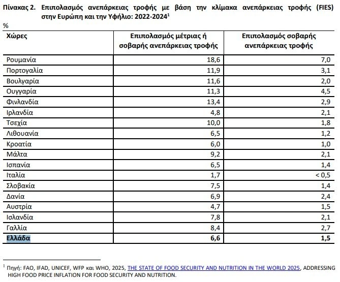 Στον Πίνακα 2 παρουσιάζεται ο επιπολασμός ανεπάρκειας τροφής του συνολικού πληθυσμού, με βάση την κλίμακα ανεπάρκειας τροφής (Food Insecurity Experience Scale – FIES) στην Ευρώπη και την Υφήλιο, για την τριετία 2022-2024: