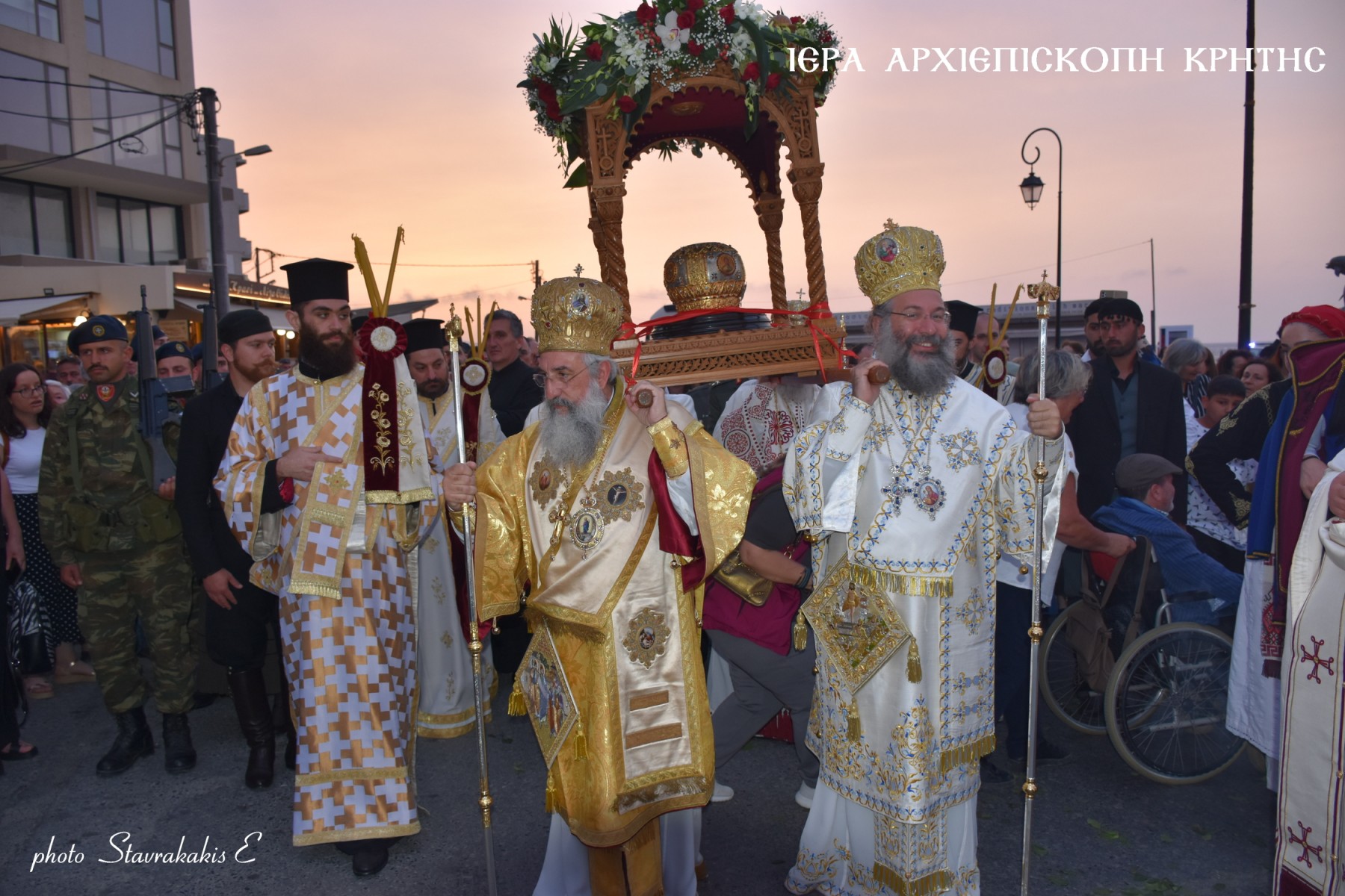 Το απόγευμα της ίδιας ημέρας, τελέσθηκε μεθέορτος Πανηγυρικός Αρχιερατικός Εσπερινός, χοροστατούντος του Σεβασμιωτάτου Μητροπολίτου Κυδωνίας και Αποκορώνου κ. Δαμασκηνού και οι εορτασμοί κορυφώθηκαν με την πάνδημη λιτάνευση των Τιμίων Καρών, του Αγίου Αποστόλου Τίτου και των Αγίων Τεσσάρων Νεομαρτύρων Ρεθύμνης. Με την περάτωση της Λιτανείας, ο Σεβασμιώτατος Αρχιεπίσκοπος Κρήτης κ.κ. Ευγένιος αναφέρθηκε στο σπουδαίο ιστορικό γεγονός της επανακομιδής της Τιμίας Κάρας του Αγίου Αποστόλου Τίτου και στις αξίες που μεταλαμπαδεύει στις επόμενες γενιές η παρουσία του Αγίου Τίτου, και αφού ευχαρίστησε για άλλη μια φορά τους αδελφούς του Αρχιερείς για την τιμητική τους παρουσία, που φανερώνει και ενισχύει την ενότητα της Εκκλησίας Κρήτης, αναφέρθηκε με συγκίνηση στο ιστορικής σημασίας γεγονός, της ευλογητικής παρουσίας για πρώτη φορά στο Ηράκλειο των Τιμίων Καρών των Αγίων Τεσσάρων Νεομαρτύρων, 200 χρόνια μετά το μαρτύριό τους, και ευχαρίστησε τον Σεβασμιώτατο Μητροπολίτη Ρεθύμνης και Αυλοποτάμου κ. Πρόδρομο, ο οποίος αποδέχθηκε ασμένως την πρόσκληση να τις συνοδεύσει, μαζί με κληρικούς της Μητροπόλεώς του, στην Πόλη του Μεγάλου Κάστρου.