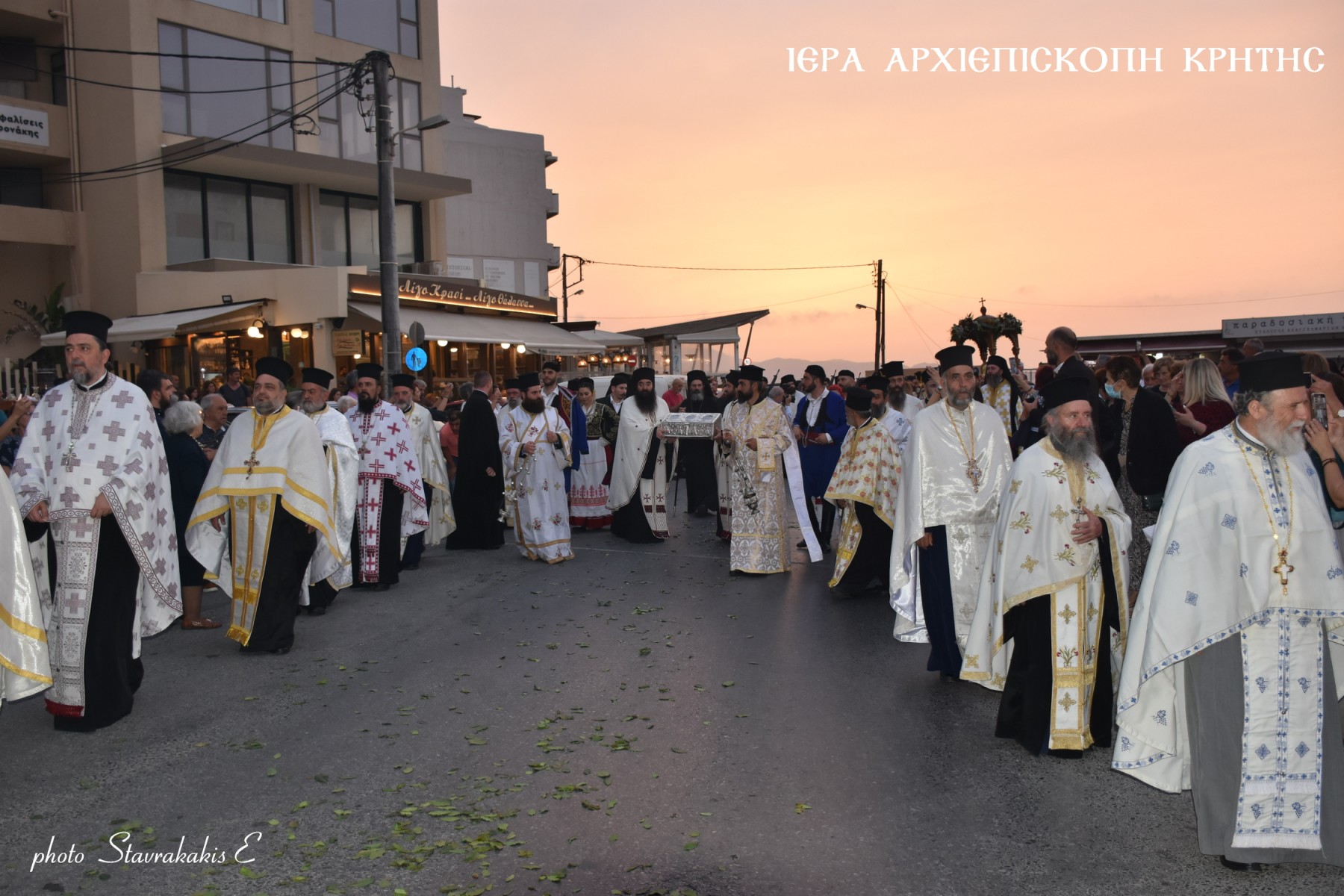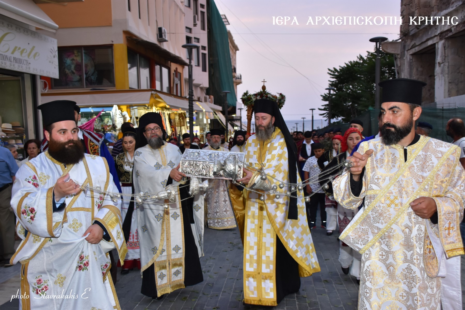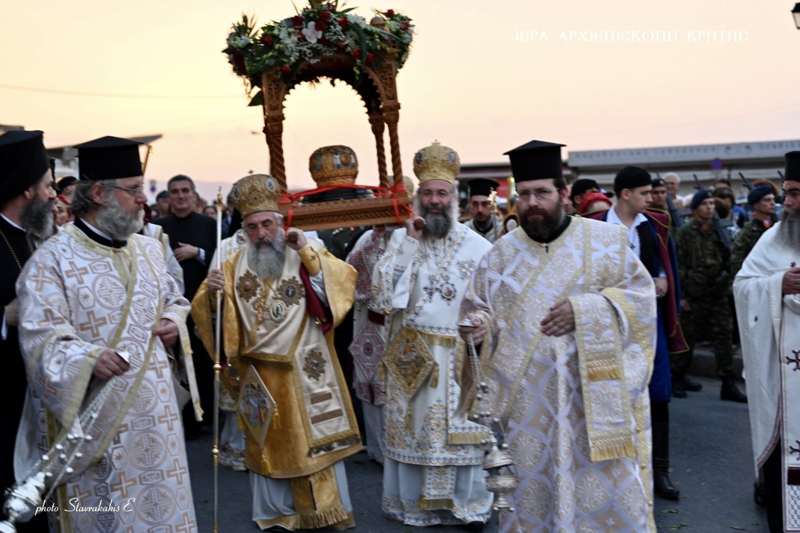 Το απόγευμα της ίδιας ημέρας, τελέσθηκε μεθέορτος Πανηγυρικός Αρχιερατικός Εσπερινός, χοροστατούντος του Σεβασμιωτάτου Μητροπολίτου Κυδωνίας και Αποκορώνου κ. Δαμασκηνού και οι εορτασμοί κορυφώθηκαν με την πάνδημη λιτάνευση των Τιμίων Καρών, του Αγίου Αποστόλου Τίτου και των Αγίων Τεσσάρων Νεομαρτύρων Ρεθύμνης. Με την περάτωση της Λιτανείας, ο Σεβασμιώτατος Αρχιεπίσκοπος Κρήτης κ.κ. Ευγένιος αναφέρθηκε στο σπουδαίο ιστορικό γεγονός της επανακομιδής της Τιμίας Κάρας του Αγίου Αποστόλου Τίτου και στις αξίες που μεταλαμπαδεύει στις επόμενες γενιές η παρουσία του Αγίου Τίτου, και αφού ευχαρίστησε για άλλη μια φορά τους αδελφούς του Αρχιερείς για την τιμητική τους παρουσία, που φανερώνει και ενισχύει την ενότητα της Εκκλησίας Κρήτης, αναφέρθηκε με συγκίνηση στο ιστορικής σημασίας γεγονός, της ευλογητικής παρουσίας για πρώτη φορά στο Ηράκλειο των Τιμίων Καρών των Αγίων Τεσσάρων Νεομαρτύρων, 200 χρόνια μετά το μαρτύριό τους, και ευχαρίστησε τον Σεβασμιώτατο Μητροπολίτη Ρεθύμνης και Αυλοποτάμου κ. Πρόδρομο, ο οποίος αποδέχθηκε ασμένως την πρόσκληση να τις συνοδεύσει, μαζί με κληρικούς της Μητροπόλεώς του, στην Πόλη του Μεγάλου Κάστρου.