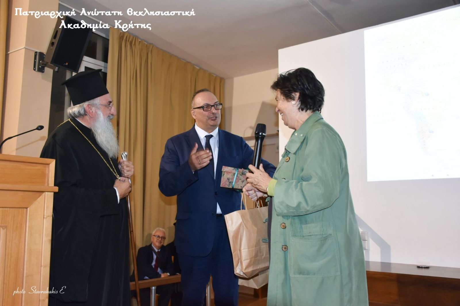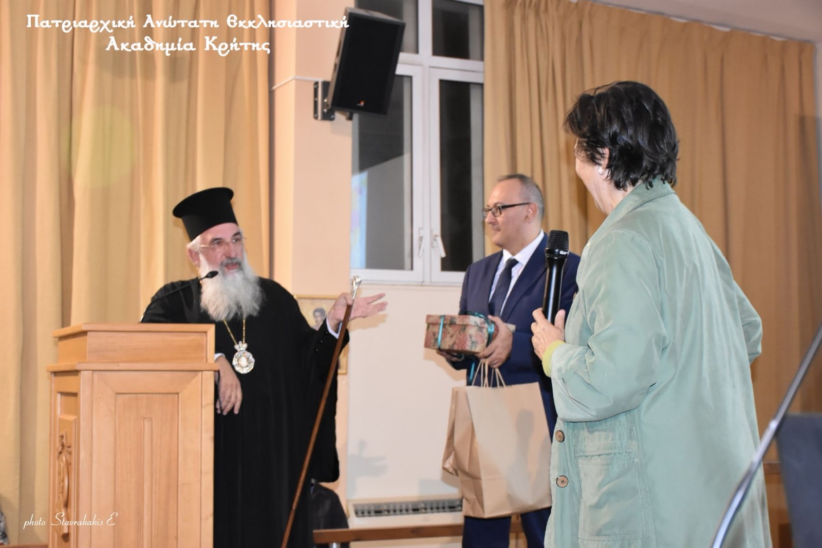 Παρόντες στην εκδήλωση, εκτός από το πολυπληθές ακροατήριο, ήταν ο Σεβ. Αρχιεπίσκοπος Κρήτης κ. Ευγένιος, ο οποίος συνεχάρη τους διοργανωτές της εκδήλωσης και επέδωσε εκ μέρους της Π.Α.Ε.Α.Κ. αναμνηστικά δώρα στην Μαρία Ευθυμίου, ο Σεβ. Μητροπολίτης Σελευκείας κ. Θεόδωρος, ο Θεοφιλ. Επίσκοπος Κνωσού κ. Μεθόδιος, ο Πανοσιολ. Αρχιμανδρίτης κ. Νικηφόρος Κουνάλης, Γενικός Αρχιερατικός Επίτροπος της Αρχιεπισκοπής Κρήτης, πλήθος κληρικών, Άρχοντες Οφικιάλιοι της Μ.τ.Χ.Ε., ο κ. Κώστας Βαρβεράκης, Πρόεδρος ΔΕΠΑΝΑΛ του Δήμου Ηρακλείου, Καθηγητές της Πατριαρχικής Ακαδημίας και μέλη του Διοικητικού Προσωπικού, φοιτητές, εκπαιδευτικοί και μέλη της τοπικής κοινωνίας.