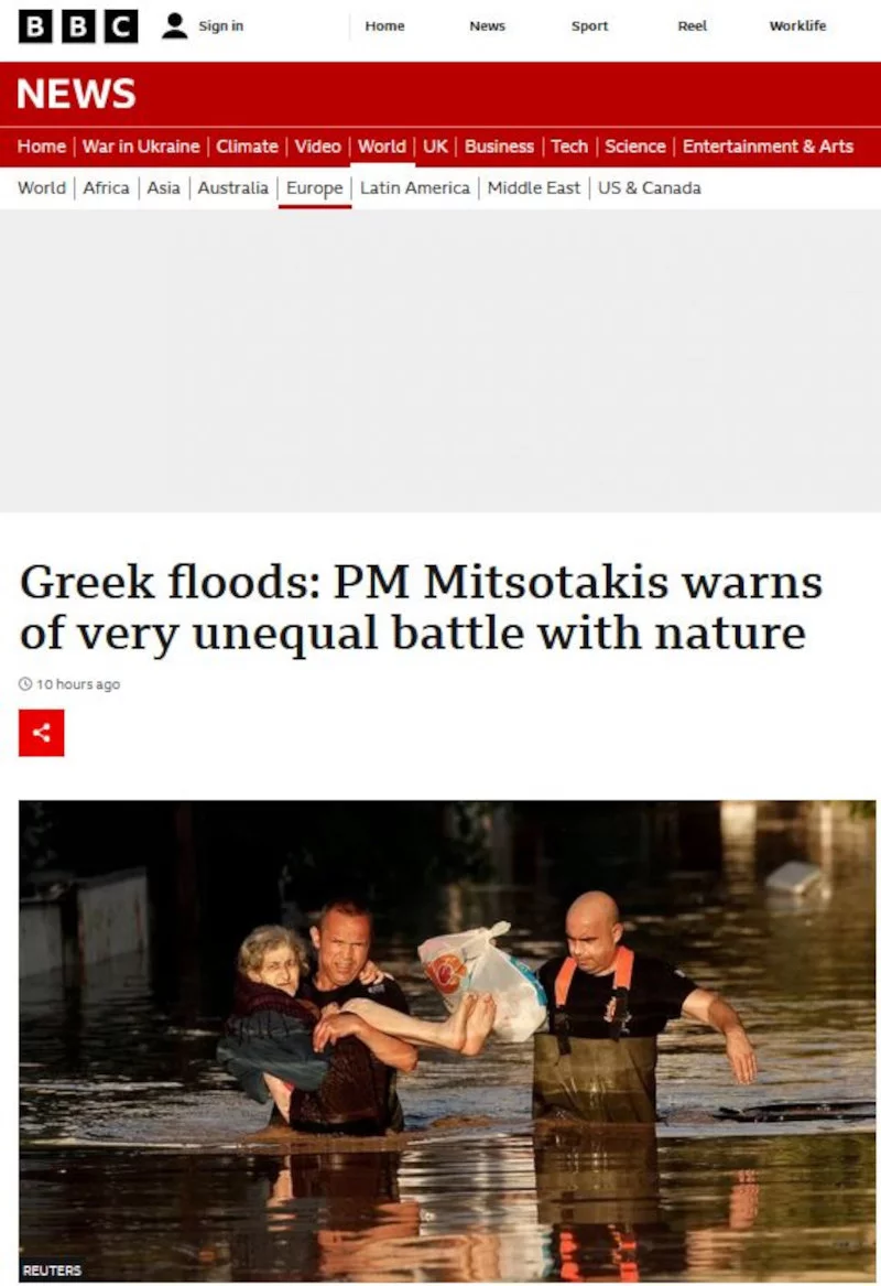 «Πλημμύρες στην Ελλάδα: Ο πρωθυπουργός Μητσοτάκης προειδοποιεί για πολύ άνιση μάχη με τη φύση», μεταδίδει το BBC.