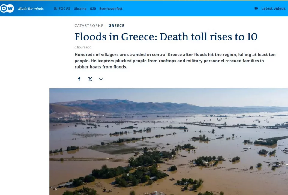 «Πλημμύρες στην Ελλάδα: Στους 10 ανεβαίνει ο απολογισμός των νεκρών», μεταδίδει η Deutsche Welle σημειώνοντας: «οι πλημμύρες στην Ελλάδα ακολούθησαν μια τεράστια δασική πυρκαγιά στα βόρεια και το πιο ζεστό καλοκαίρι της χώρας που έχει καταγραφεί. Επιστήμονες λένε ότι η Ελλάδα βρίσκεται στην πρώτη γραμμή της κλιματικής αλλαγής και τα ασυνήθιστα καιρικά φαινόμενα γίνονται όλο και πιο συνηθισμένα.