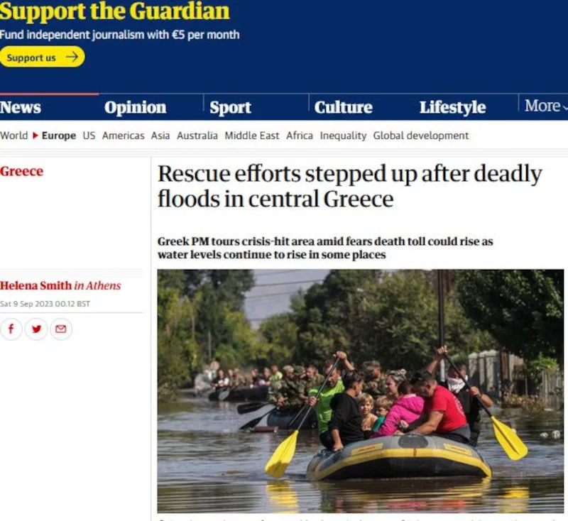«Εντείνονται οι προσπάθειες διάσωσης μετά τις φονικές πλημμύρες στην κεντρική Ελλάδα», μεταδίδει ο Guardian.