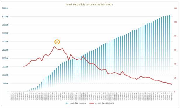 Στο σχήμα 1 που αφορά τα δεδομένα του Ισραήλ, παρατηρούμε με τις μπλε κάθετες γραμμές τον αθροιστικό αριθμό εμβολιασμένων στην κοινότητα που έλαβαν και την 2η δόση. Στην κόκκινη γραμμή απεικονίζεται ο κινητός μέσος όρος 7 ημερών των θανάτων. Αρχικά οι θάνατοι ανερχόταν παράλληλα με την άνοδο των εμβολιασμένων. Η κορύφωση των θανάτων επήλθε στο σημείο Α περίπου στα μέσα του τελευταίου δεκαήμερου του Ιανουαρίου, έχοντας εμβολιαστεί περίπου το 14% του πληθυσμού.