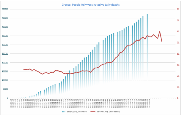 Στην χώρα μας μέχρι 27/3 έχει εμβολιαστεί με τις δύο δόσεις περίπου το 5% του πληθυσμού έχοντας 3.133 κρούσματα. Με την μία δόση έχει εμβολιαστεί περίπου το 10% του πληθυσμού. Ο κινητός μέσος όρος θανάτων των 7 ημερών, αρχικά ήταν ανοδικός παράλληλα με την αύξηση των εμβολίων όπως ακριβώς και στο Ισραήλ. Τις τελευταίες μέρες, δείχνει μία σταθεροποίηση.