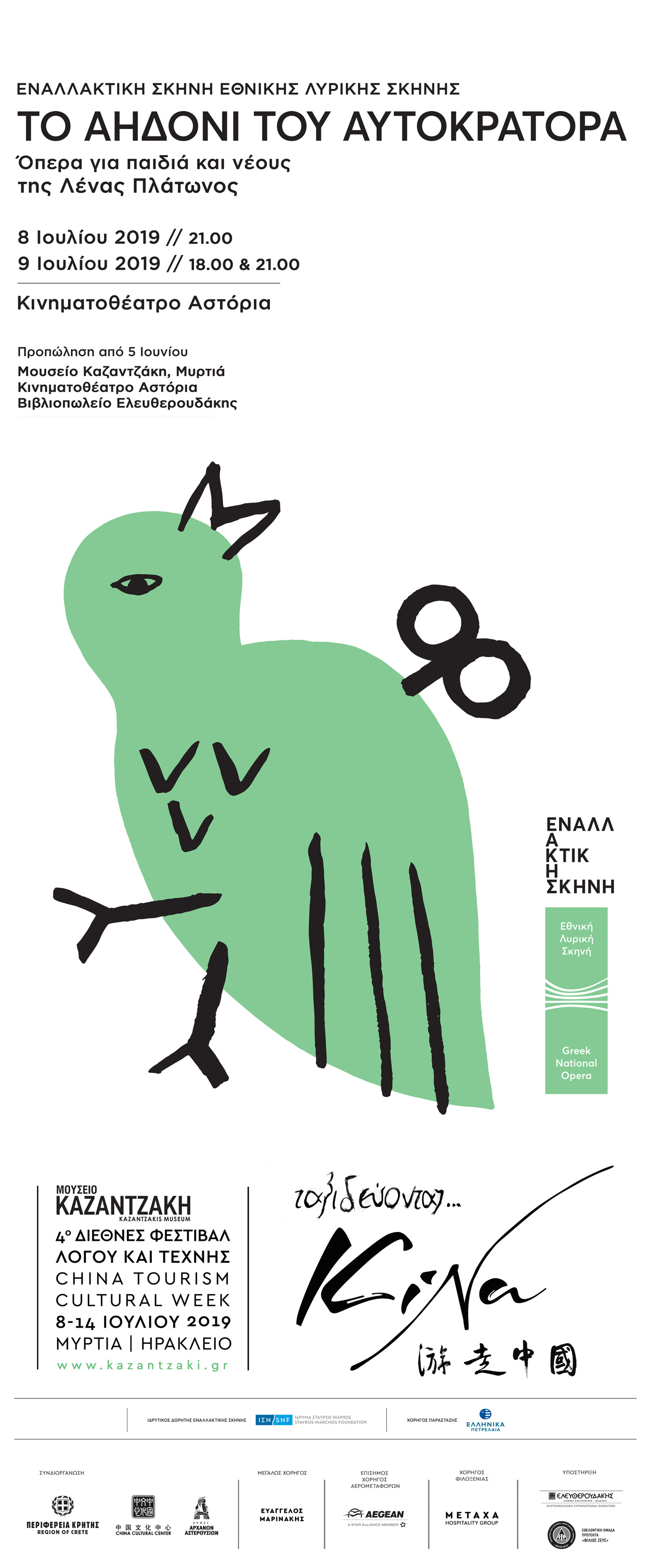 Στο πλαίσιο του Φεστιβάλ «Ταξιδεύοντας… Κίνα», που διοργανώνει το Μουσείο Καζαντζάκη, η Εναλλακτική Σκηνή Εθνικής Λυρικής Σκηνής θα παρουσιάσει την όπερα για παιδιά και νέους «Το αηδόνι του αυτοκράτορα», της Λένας Πλάτωνος. Το έργο θα παρουσιαστεί στο Κινηματοθέατρο Αστόρια τη Δευτέρα 8 Ιουλίου στις 21.00 και την Τρίτη 9 Ιουλίου στις 18.00 και στις 21.00.