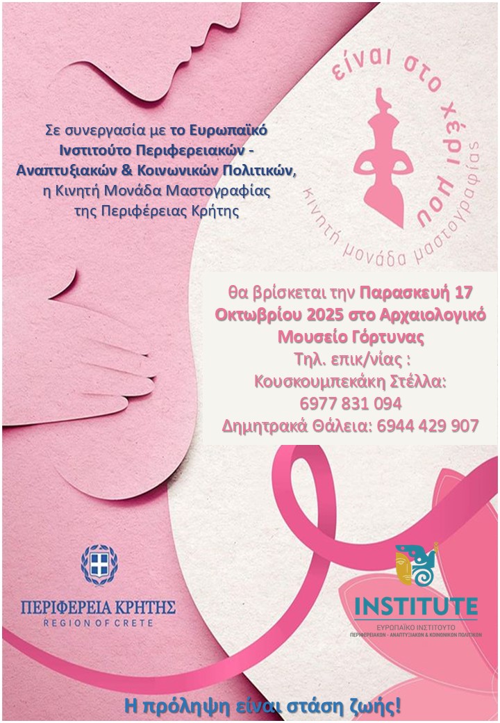 Η Κινητή Μονάδα Μαστογραφίας της Περιφέρειας Κρήτης συνεχίζει την διαδρομή της προσφοράς, με στόχο την πρόληψη του καρκίνου του μαστού και σταθμεύει την Παρασκευή 17 Οκτωβρίου 2025 (από τις 09:00) στο Αρχαιολογικό Μουσείο Μεσαράς. Η δράση, που διοργανώνεται από την Περιφέρεια Κρήτης, σε συνεργασία με το Ευρωπαϊκό Ινστιτούτο Περιφερειακών – Αναπτυξιακών & Κοινωνικών Πολιτικών, στο πλαίσιο του Gortys Forum 2025, θα δώσει την ευκαιρία σε γυναίκες ηλικίας άνω των 40 ετών να υποβληθούν, δωρεάν, σε μαστογραφικό έλεγχο. Προτεραιότητα θα δοθεί στις γυναίκες που, έως τώρα, δεν έχουν υποβληθεί ποτέ σε μαστογραφικό έλεγχο και σε ανασφάλιστες γυναίκες. Για περισσότερες πληροφορίες και ραντεβού, οι ενδιαφερόμενες παρακαλούνται να απευθύνονται στα τηλέφωνα 2892340340 και 2892340350.