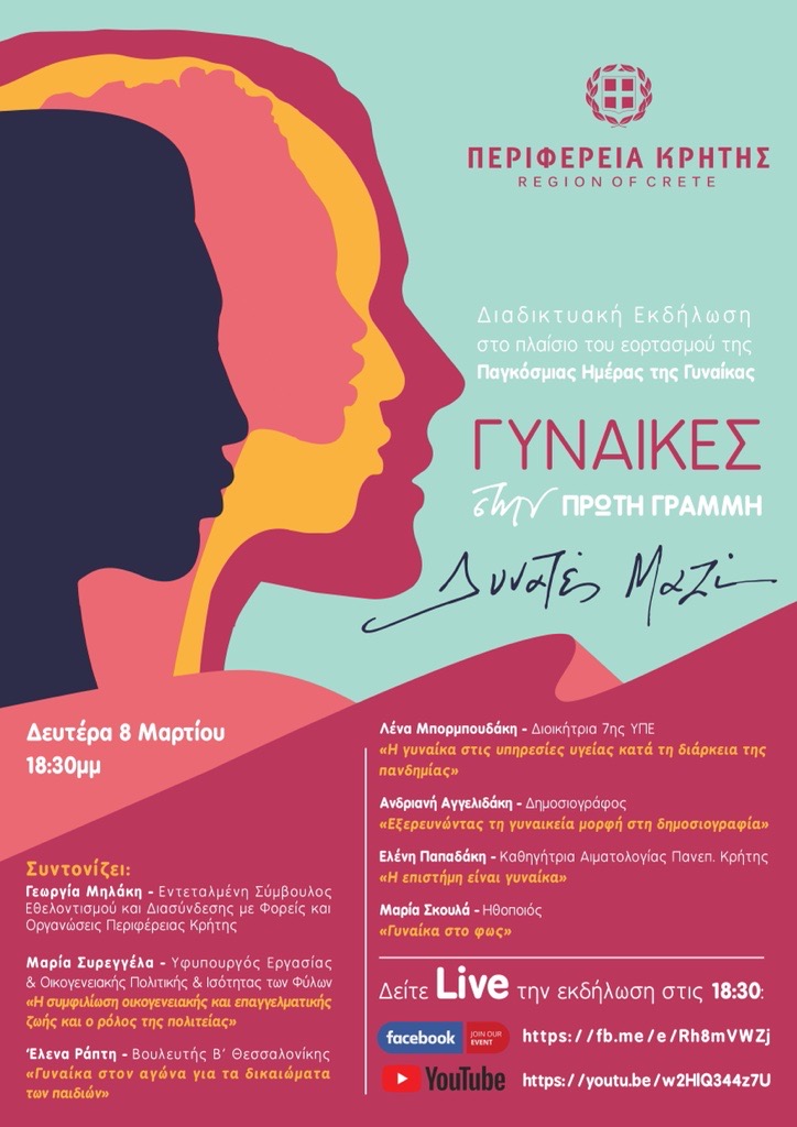 Με επιτυχία πραγματοποιήθηκε Διαδικτυακή εκδήλωση της Περιφέρειας Κρήτης με αφορμή την Παγκόσμια Ημέρα της Γυναίκας, την Δευτέρα 8 Μαρτίου. Την εκδήλωση με κεντρικό σύνθημα «Γυναίκες στην Πρώτη γραμμή – Δυνατές Μαζί» συντόνισε η Εντεταλμένη Σύμβουλος Εθελοντισμού και Διασύνδεσης με Φορείς και Οργανώσεις της Περιφέρειας Κρήτης, Γεωργία Μηλάκη. Στην εκδήλωση συμμετείχαν γυναίκες από όλο το φάσμα της πολιτικής και κοινωνικής ζωής. Ανάμεσα τους, η Υφυπουργός Εργασίας και Κοινωνικών Υποθέσεων – Γ.Γ. Δημογραφικής και Οικογενειακής Πολιτικής και Ισότητας των Φύλων Μαρία Συρεγγέλα, η οποία επικεντρώθηκε «στη συμφιλίωση οικογενειακής και επαγγελματικής ζωής και το ρόλο της πολιτείας». Η Βουλευτής Έλενα Ράπτη, η οποία αναφέρθηκε «στη γυναίκα στον αγώνα για τα δικαιώματα των παιδιών». Η Διοικήτρια της 7ης ΥΠΕ Λένα Μπορμπουδάκη, η οποία μίλησε «για τις γυναίκες στις υπηρεσίες υγείας κατά τη διάρκεια της πανδημίας». Η δημοσιογράφος Ανδριανή Αγγελιδάκη, η οποία παρουσίασε «το ρόλο της γυναικείας μορφής στη δημοσιογραφία». Η ηθοποιός Μαρία Σκουλά που μίλησε «για τη γυναίκα στο φως» και η Καθηγήτρια Αιματολογίας και Διευθύντρια της Αιματολογικής Κλινικής ΠΑΓΝΗ και της ΔηΤΟΒ Κρήτης, Ελένη Παπαδάκη. Χαιρετισμό απηύθυναν η αντιπεριφερειάρχης Ρεθύμνου Μαρία Λιονή, η αντιπεριφερειάρχης Οικονομικών Μαρία Χανιωτάκη-Μυλωνάκη, η εντεταλμένη σύμβουλος Παιδείας, Υγείας και Πολιτισμού της ΠΕ Χανίων Σοφία Μαλανδράκη-Κρασουδάκη και η περιφερειακή σύμβουλος και πρόεδρος Arepo Ειρήνη Χουδετσανάκη.
