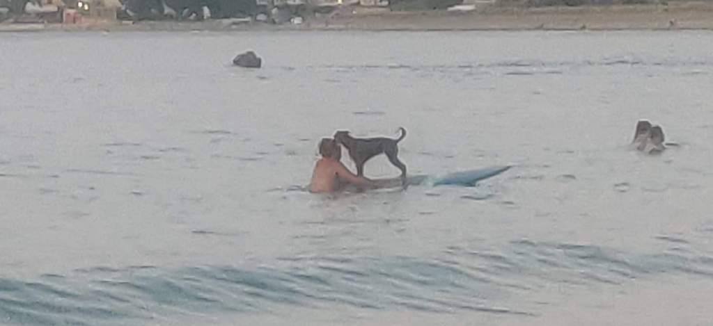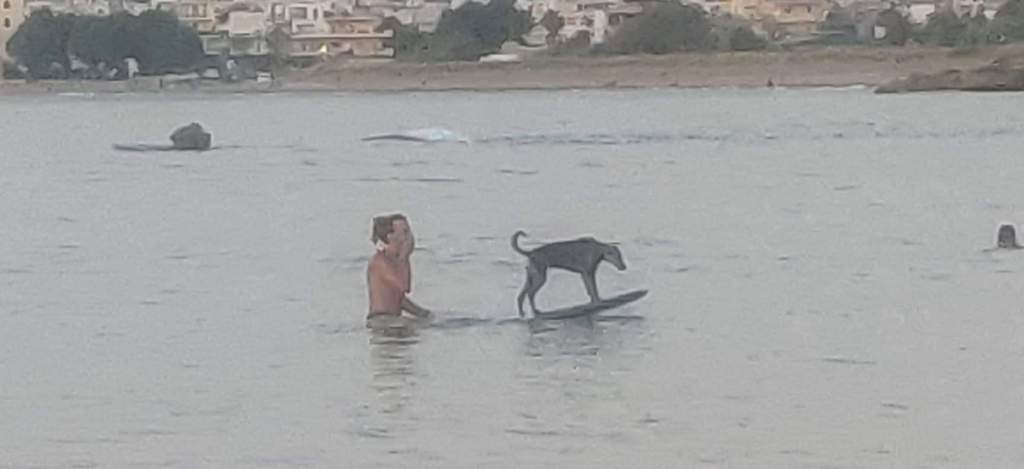 Μόλις δει σανίδα του σερφ μπαίνει στη θάλασσα μαζί με το αφεντικό της και γίνεται… η ατραξιόν της παραλίας.