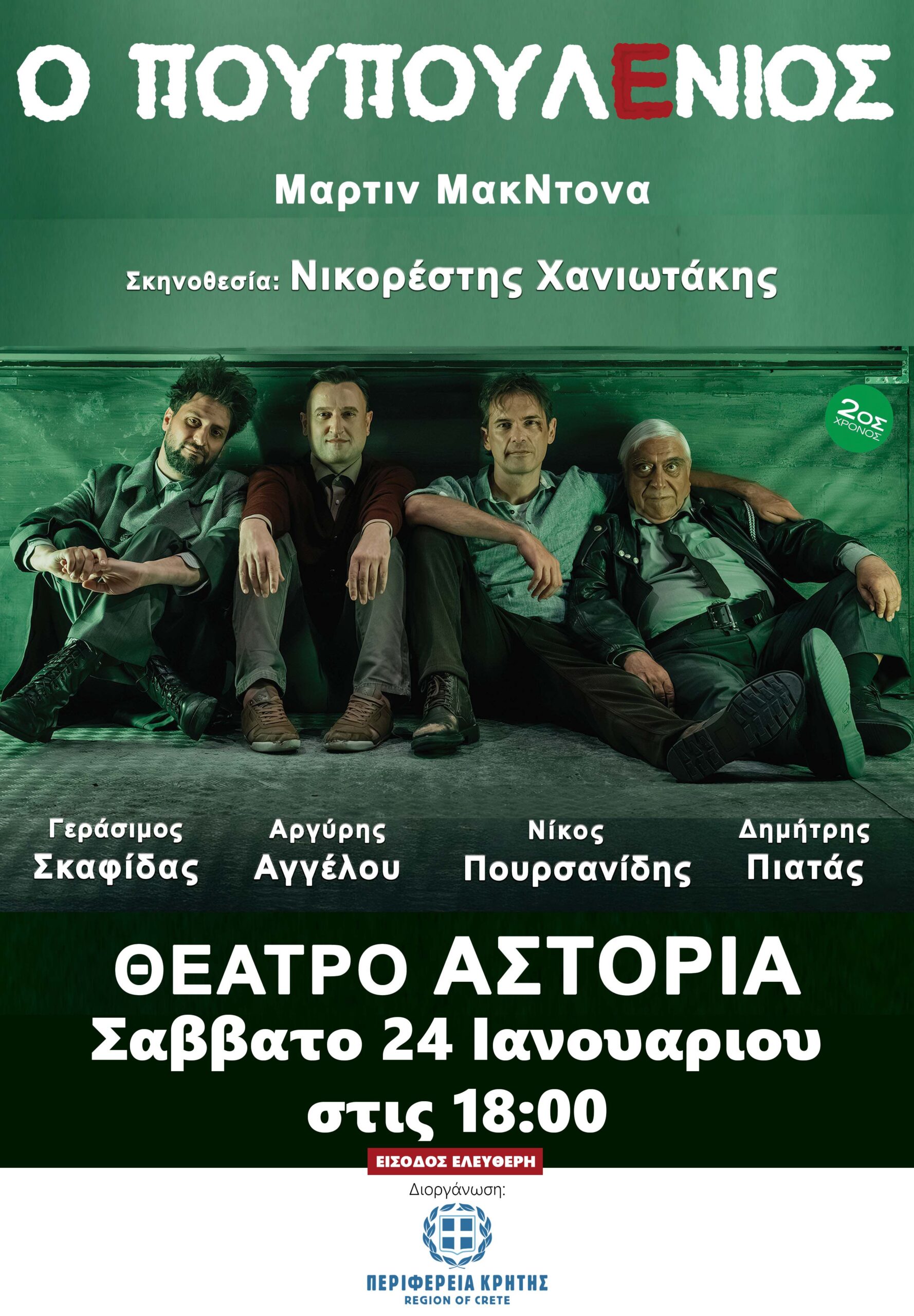 Η πολυβραβευμένη παράσταση «Ο Πουπουλένιος» (The Pillowman) του Μάρτιν ΜακΝτόνα σε σκηνοθεσία Νικορέστη Χανιωτάκη, μετά από έναν χρόνο επιτυχημένων παραστάσεων στην Αθήνα, όπου κέρδισε το κοινό και απέσπασε διθυραμβικές κριτικές, παρουσιάζεται στο κινηματοθέατρο Αστόρια, στις 24 Ιανουαρίου 2026, στις 6:00 το απόγευμα, με την υποστήριξη της Περιφέρειας Κρήτης και ελεύθερη είσοδο για το κοινό.
