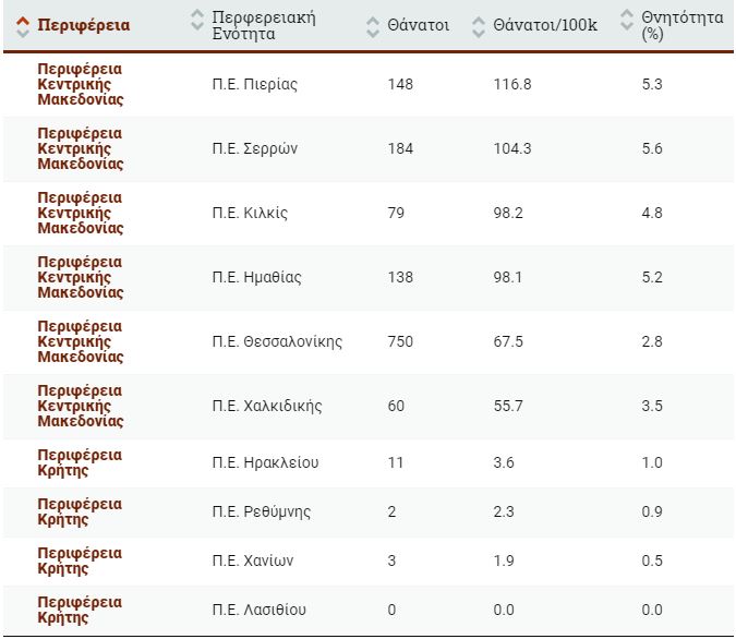 Στην Περιφερειακή Ενότητα Χανίων καταγράφονται 3 θάνατοι και ποσοστό θνητότητας 0,5%, ενώ δεν υπάρχει καταγραφή θανάτων στο Λασίθι.