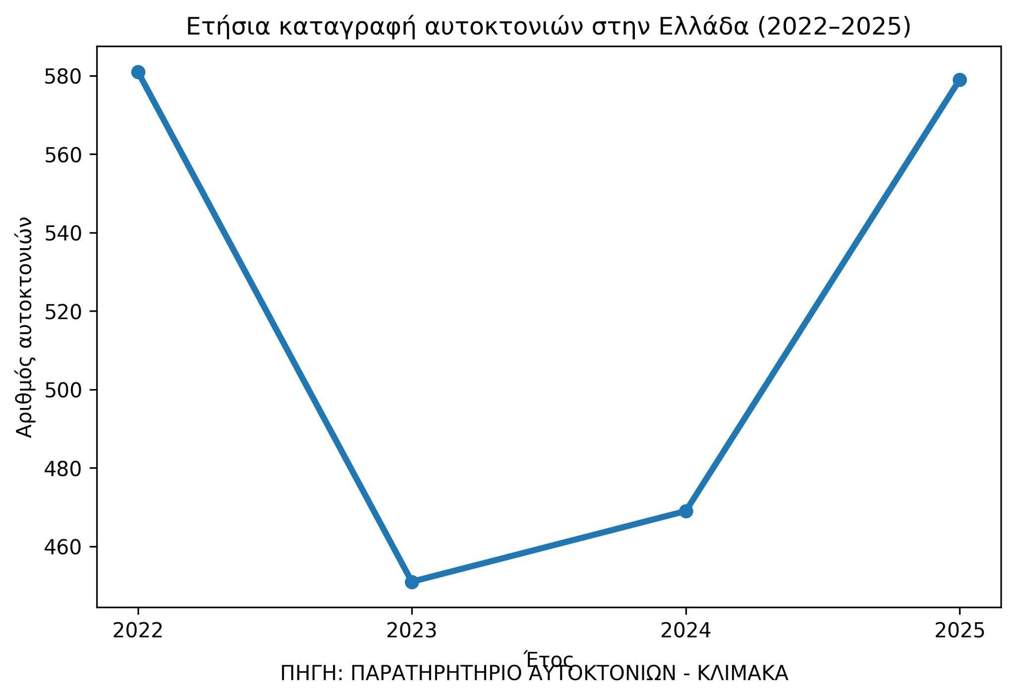 Κατά το έτος 2025 καταγράφηκαν συνολικά 579 περιστατικά αυτοκτονίας στην Ελλάδα. Η καταγραφή πραγματοποιείται σε πραγματικό χρόνο και αποτυπώνει τις βασικές τάσεις του φαινομένου. Παράλληλα, στη χώρα εξακολουθεί να μην υπάρχει ενιαίο σύστημα καταγραφής των αποπειρών αυτοκτονίας που φτάνουν στα νοσοκομεία. Ωστόσο, βάσει διεθνών επιστημονικών δεδομένων, εκτιμάται ότι πίσω από κάθε αυτοκτονία αντιστοιχούν από 20 έως 30 απόπειρες.