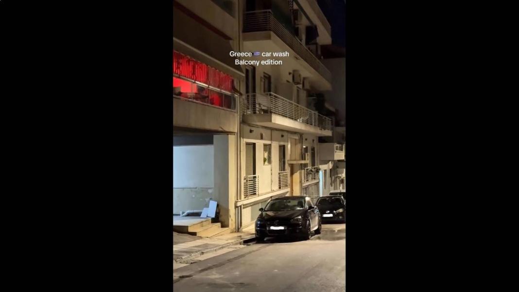 Νέο βίντεο που κυκλοφορεί στα social media καταγράφει ακόμη ένα πλύσιμο αυτοκινήτου… εξ αποστάσεως, καθώς ο ιδιοκτήτης του ρίχνει νερό από το μπαλκόνι του σπιτιού του στον πρώτο όροφο της πολυκατοικίας.